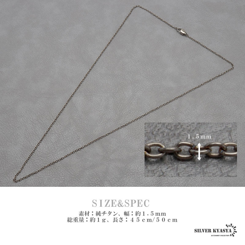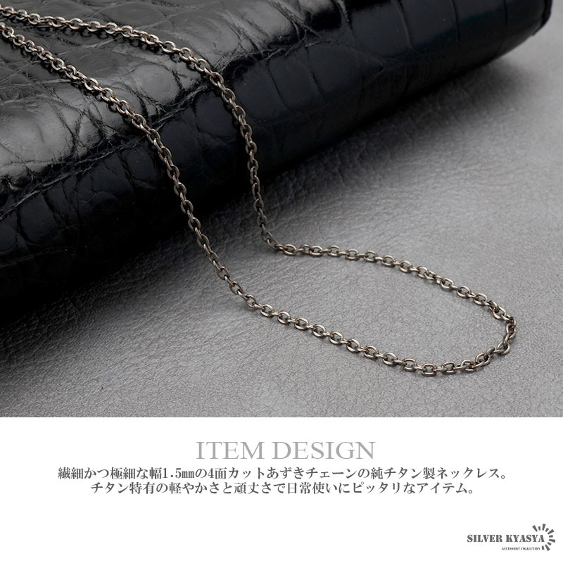 | 商品概要 | ■ITEM DETAIL 繊細かつ極細な幅1.5mmの4面カットあずきチェーンの純チタン製ネックレス。チタン特有の軽やかさと頑丈さで日常使いにピッタリなアイテム。 ■チタニウム素材 チタニウム(チタン)は耐食性が高く、汗などの水分に強い金属。そのため変色が無く、お手入れが不要!レジャーシーン等にも心強い味方です。 |