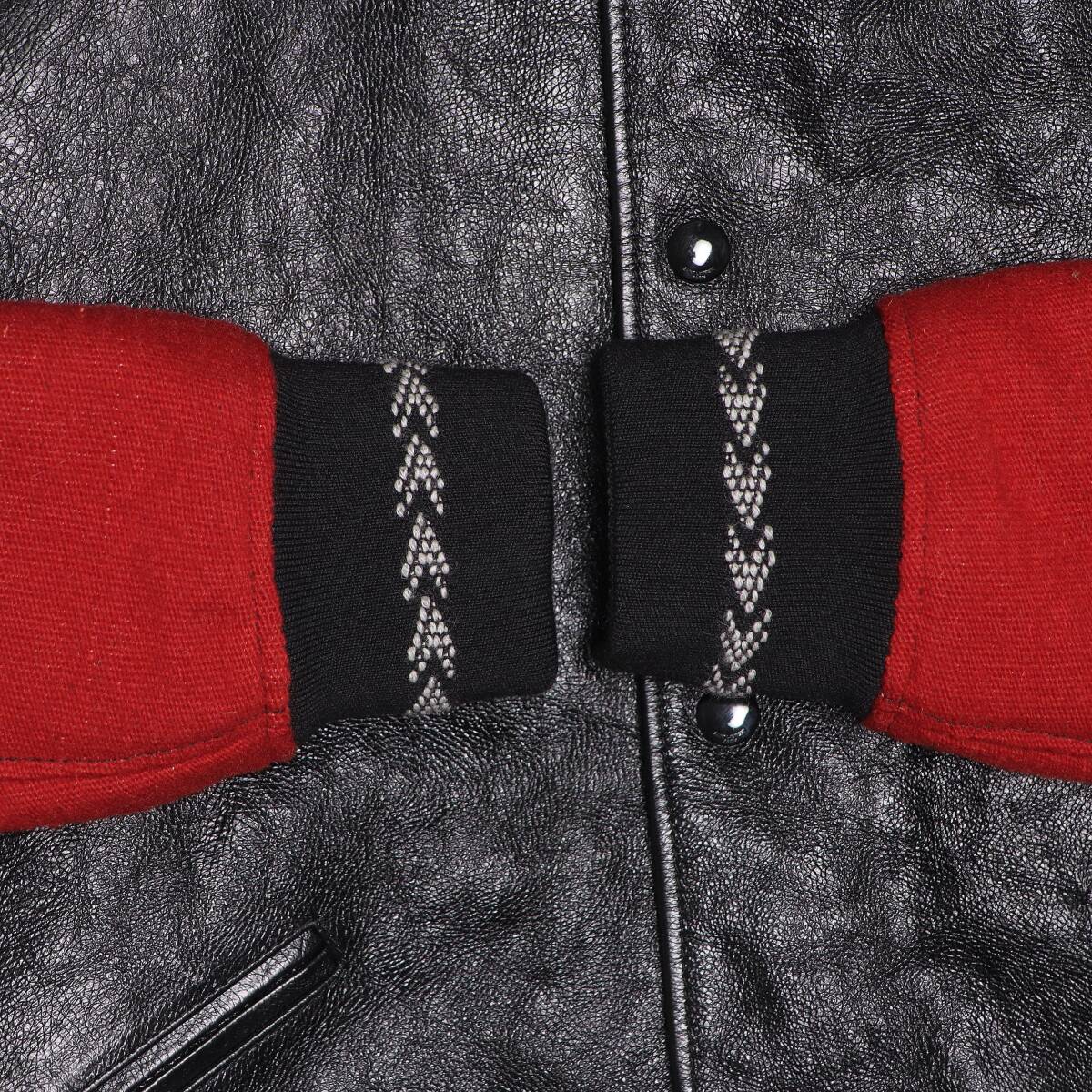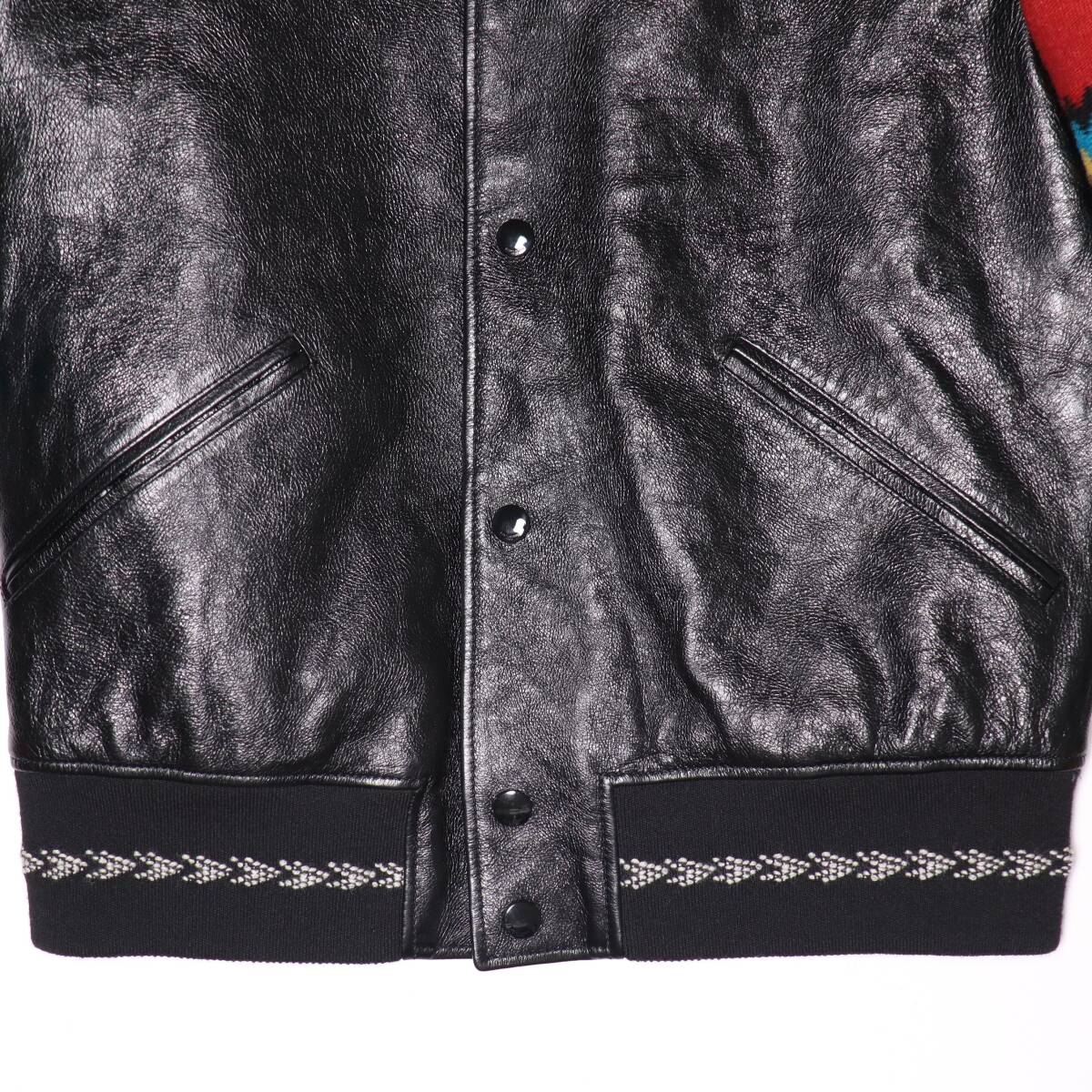 カーフスキン(仔牛革)に、ペルーのジャガード織りを模した袖で切り替えたバーシティジャケット。