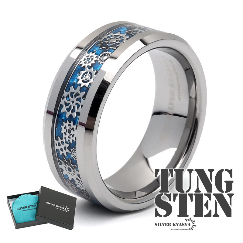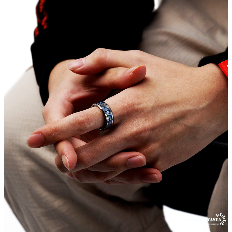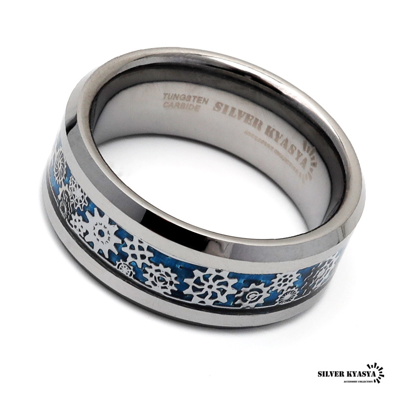 爽やかなスカイブルーカラーのカーボン調の下地に歯車のモチーフを散りばめた、遊び心あふれるリング。エッジは滑らかなカットが施されており、纏まりのあるスタイルに。