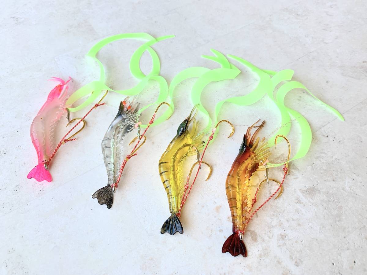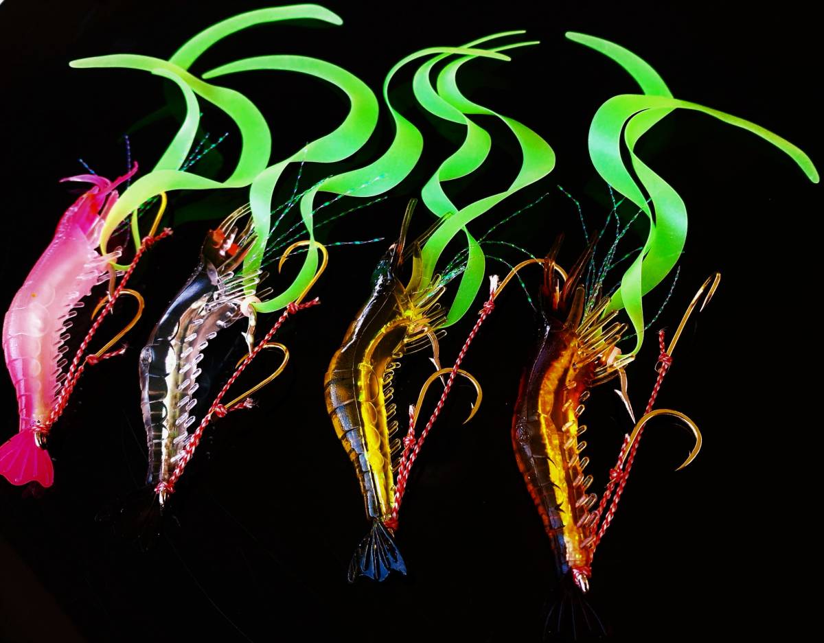 実績の高いエビワーム4種(レッド、イエロー、クリア、ピンク夜光)に