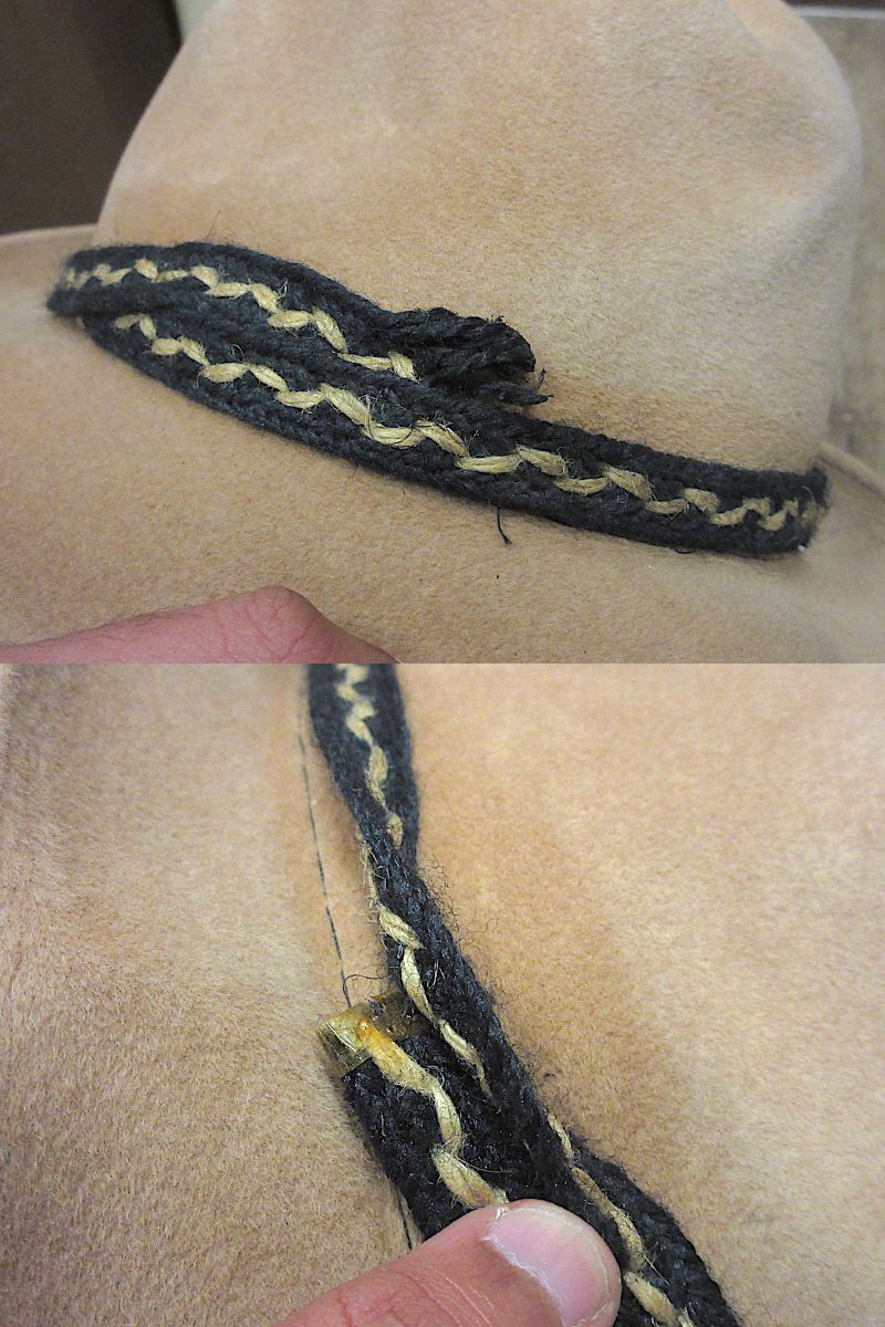 恐らくフェイクレザーのスウェットバンド、恐らくウールと化繊の混紡のリボン