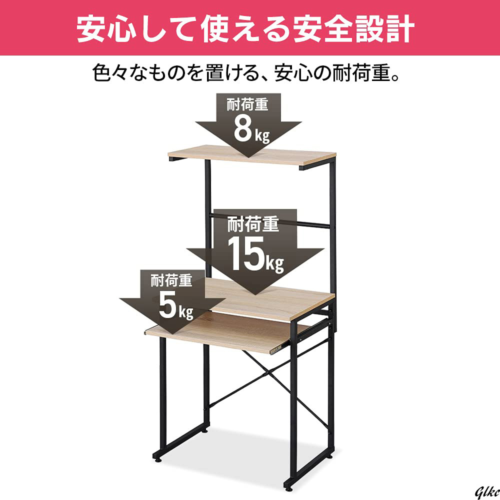 耐荷重:天板約15kg、上部棚板8kg、スライド棚板約5kg