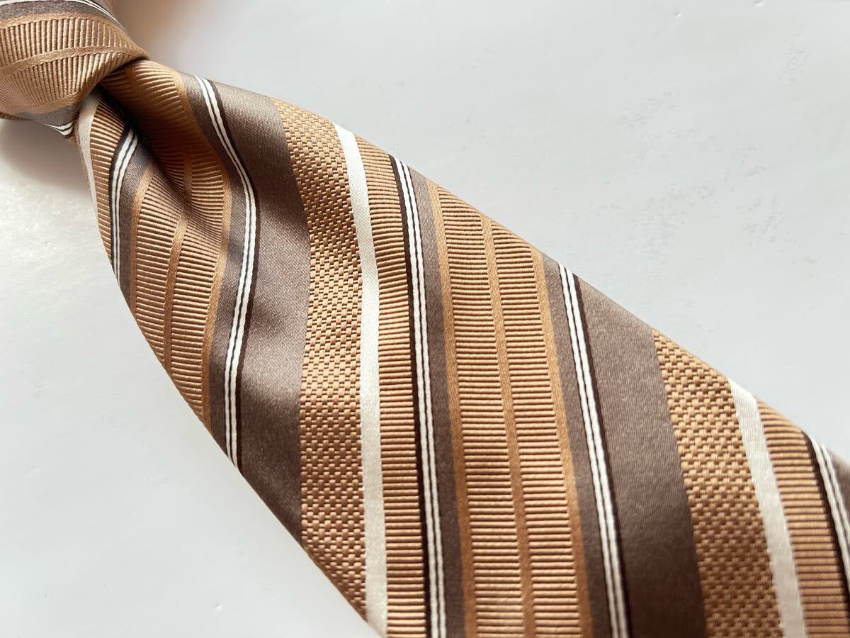 キレイなゴールドベースのレジメンタル柄で、いかにもBrioniと言うべき、ラグジュアリー感溢れるネクタイです。