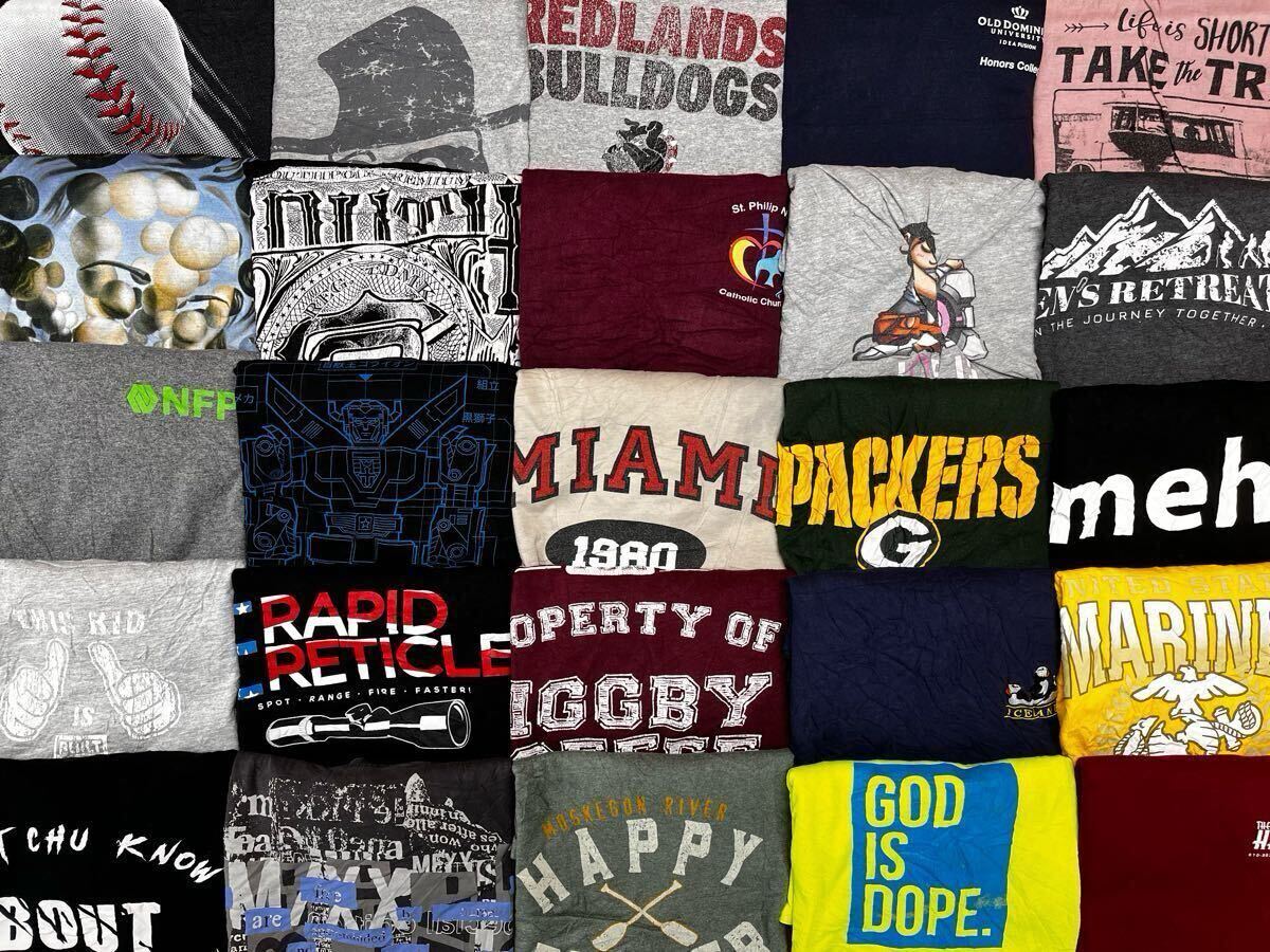 両面バックプリント・バンドロック・キャラクター・チーム物・ロゴ・文字・丸首・Vネックなど様々なデザインのランダムミックスになります。