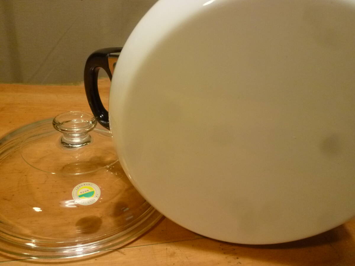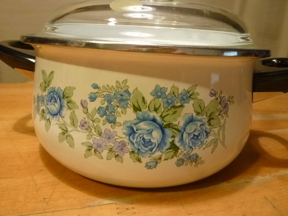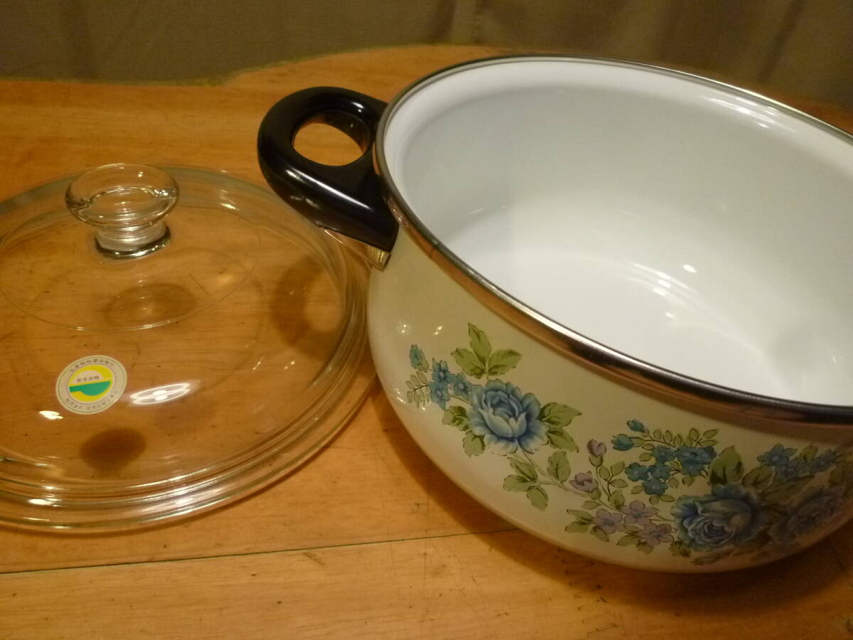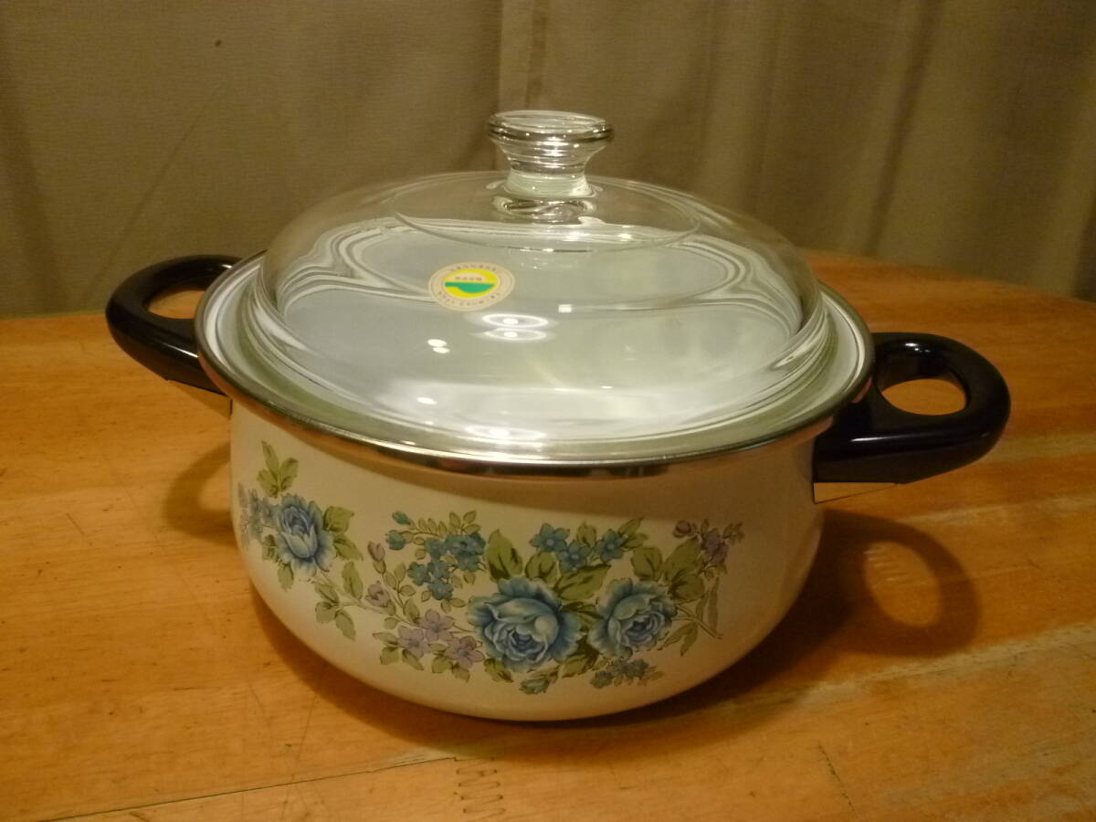 こちらはホーロー製の鍋 大 未使用品になります。ブルー色のバラの花がプリントされたもので、フタは厚手のガラス製です。