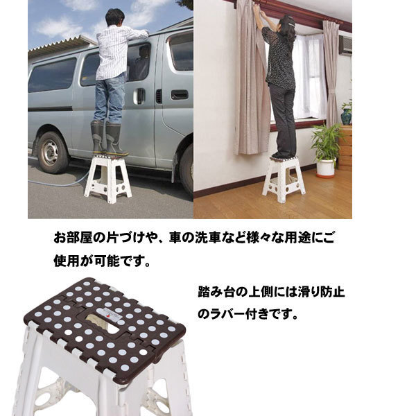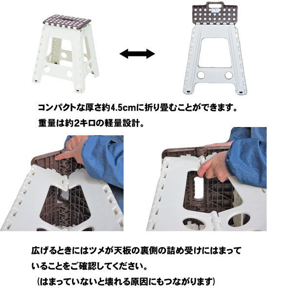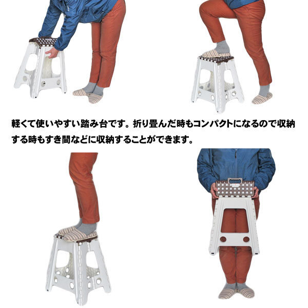 商品説明 | ワンタッチでコンパクトに収納できる踏み台です。 持ち手が付いておりますので持ち運びも楽に行うことができます。 脚の裏側には滑り止めのゴムが付いております。 踏み場には均一に滑り止めラバーが付いて足が滑りにくくなっております |