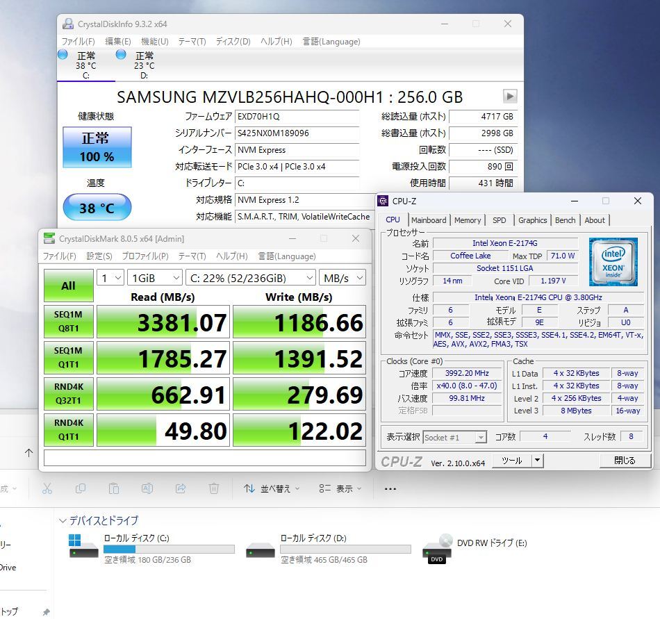 | CPU: 超高速 Intel Xeon E-2174G 3.8Ghz、 4コア8スレッド (ターボ・ブースト利用時の最大周波数 4.7GHz) |