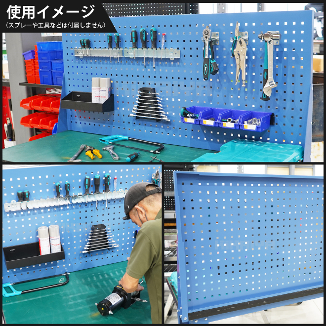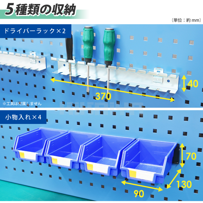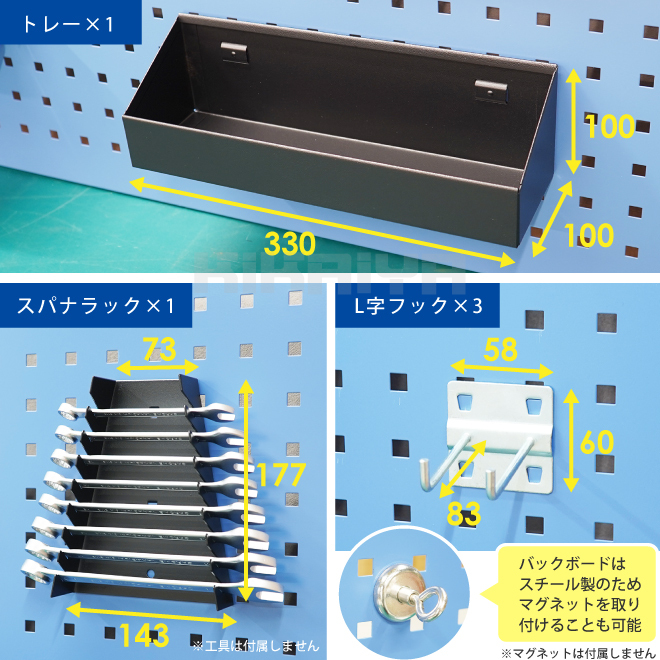 | セット内容 | ・バックボード×1 ・ドライバーラック×2 ・スパナラック×1 ・L字フック×3 ・小物入れ×4 ・トレー×1 |