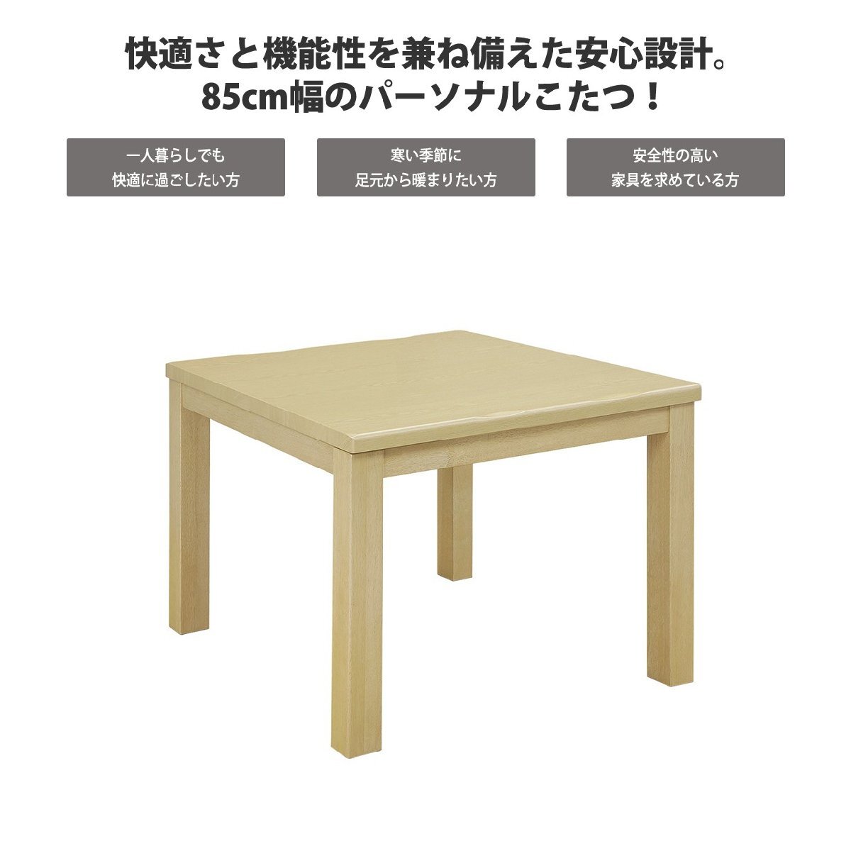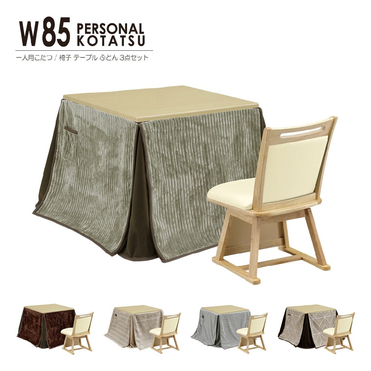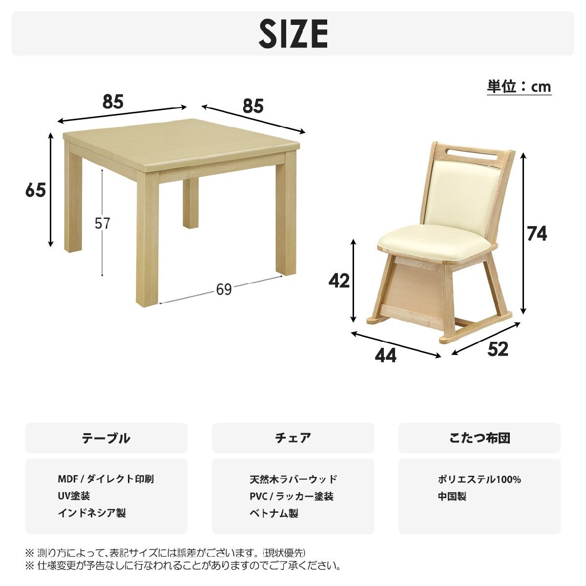 特  徴幅85cmの正方形こたつテーブルに、こたつ布団、座面回転チェアの3点セット
