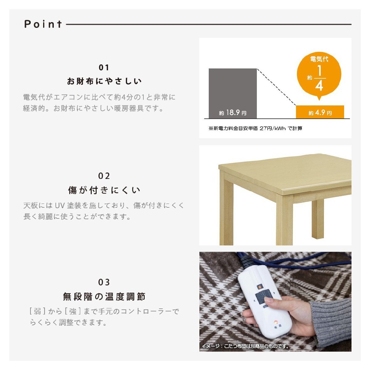 ヒーターは薄型設計でこたつ内部もゆったり広々、U字形ヒーターなので効率的に暖め、速熱・速暖で快適です。温度ヒューズ、電源コードには電流ヒューズを内蔵で念を入れた安全性の高い安心設計。