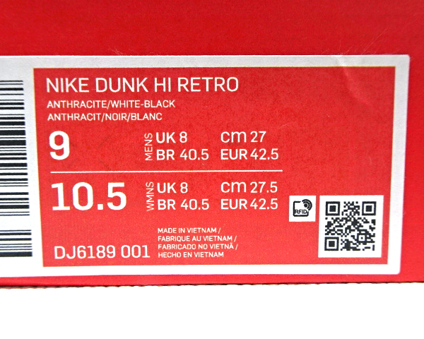 9 (27cm) 国内正規品 新品【NIKE DUNK HI RETRO DJ6189-001 ANTHRACITE/WHITE-BLACK Black Panda ナイキ ダンク ハイ レトロ】