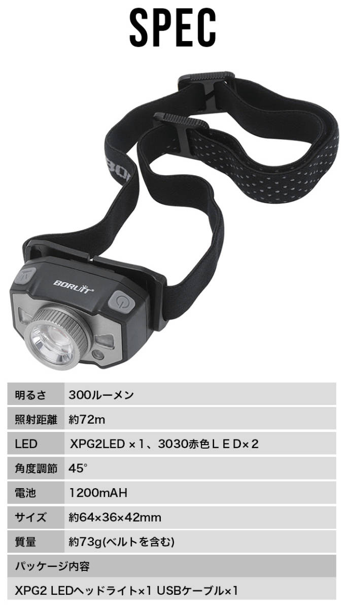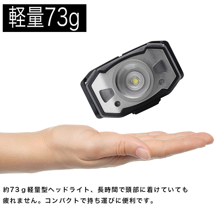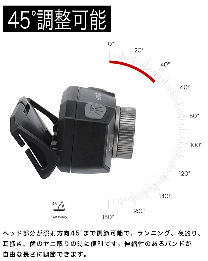 【45度調整可能・軽量73g】ヘッド部分が照射方向45度まで調節可能で、ランニング、夜釣り、耳掻き、歯のヤニ取りの時に便利です。伸縮性のあるバンドが自由な長さに調節できます。約73g軽量型ヘッドライト、長時間で頭部に着けていても疲れません。コンパクトで持ち運びに便利です。