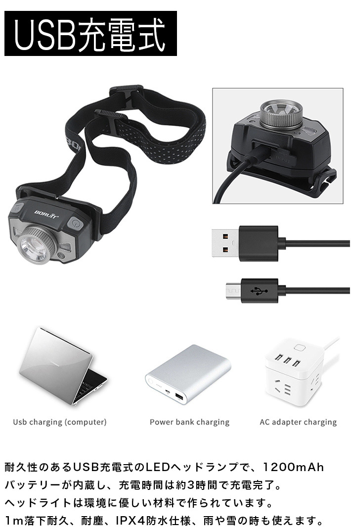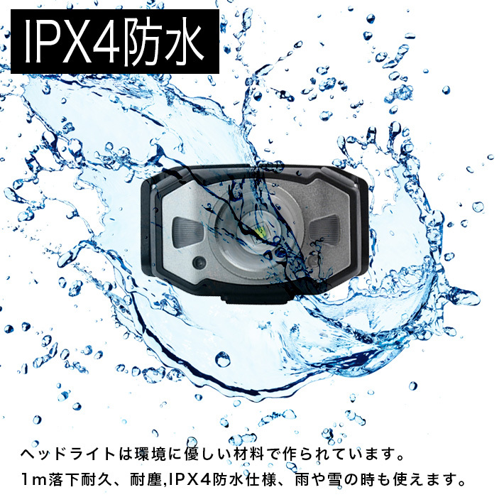 【USB充電式・IPX4防水】耐久性のあるUSB充電式のLEDヘッドランプで、1200mAhバッテリーが内蔵し、充電時間は約3時間で充電完了。ヘッドライトは環境に優しい材料で作られています,1m落下耐久、耐塵,IPX4防水仕様、雨や雪の時も使えます。