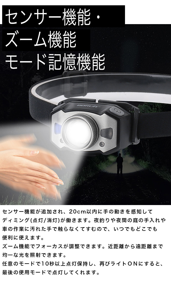【センサー機能・ズーム機能*モード記憶機能】センサー機能が追加され、20cm以内に手の動きを感知してディミング(点灯/消灯)が働きます。夜釣りや夜間の庭の手入れや車の作業に汚れた手で触らなくてすむので、いつでもどこでも便利です。