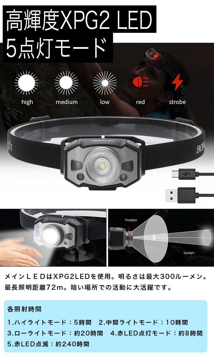 【高輝度XPG2 LED・5点灯モード】メインLEDはXPG2LEDを使用しており、明るさは最大300ルーメンに達して、72メートルの最長照明距離、暗い場所での活動に大活躍です。1.ハイライトモード/5時間。2.中間ライトモード/10時間。3.ローライトモード:約20時間。4.赤LED実用点灯モード約8時間。5.赤LED点滅:約240時間
