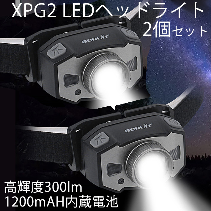 XPG2 LED ヘッドライト 2個セット 充電式5モードヘッドランプセンサー搭載ズーム機能記憶機能led300ルーメン1200mAH内蔵電池72M照射赤信号