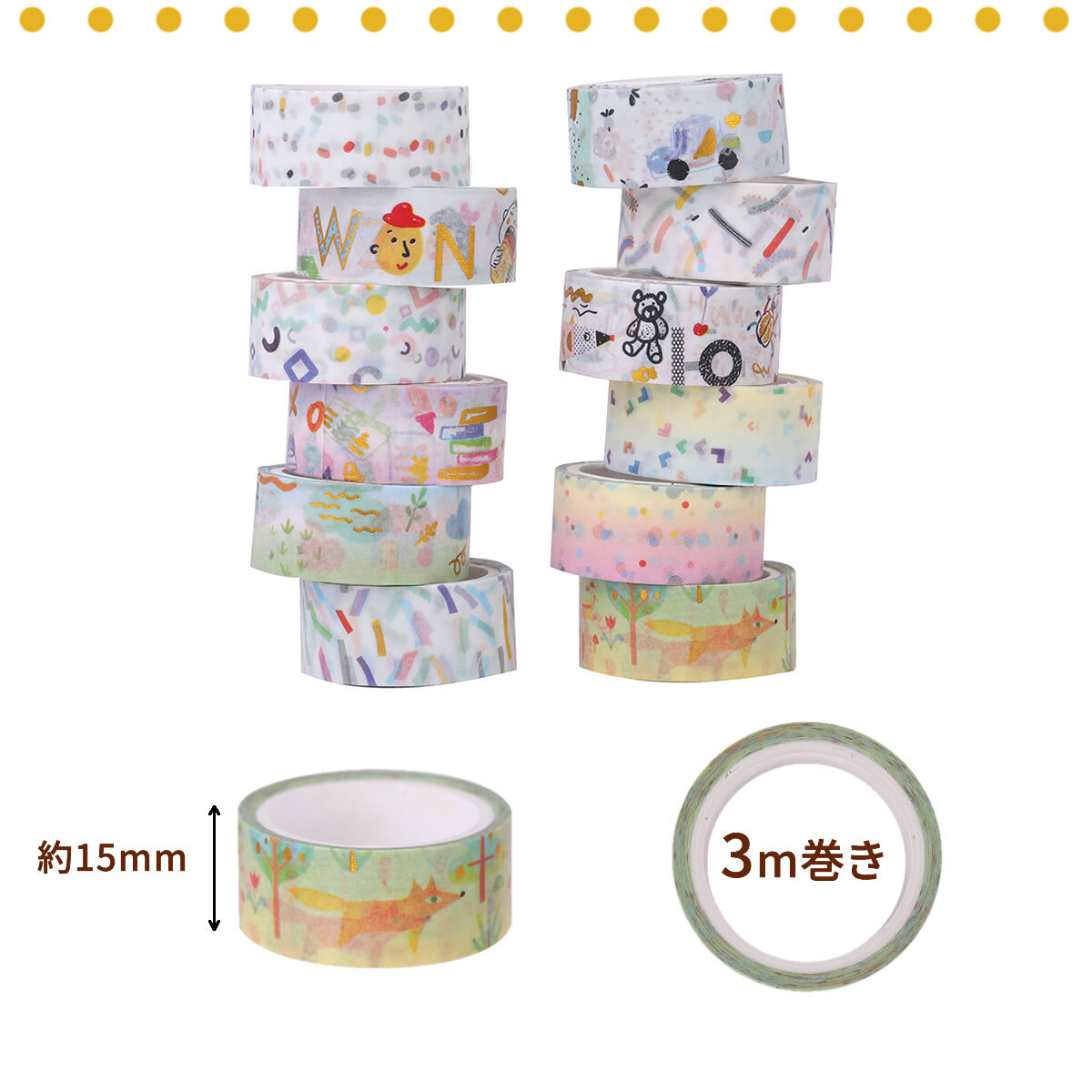 マスキングテープ 12巻セット マステ キッズペインティング 15mm×3m 子供の絵 クレヨン きつね クマ 可愛い 手帳 ラッピング 送料無料 yp