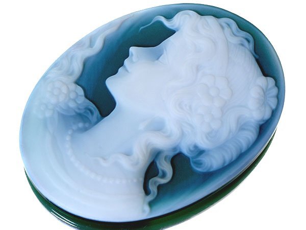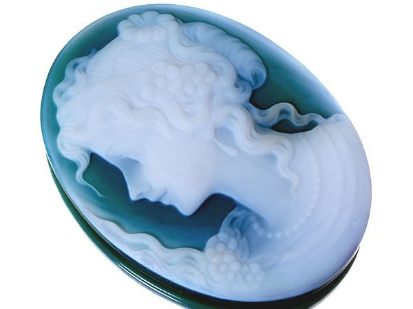 綺麗な女性を繊細に彫刻で演出した、魅力的な高級グリーンストーンカメオルースです!