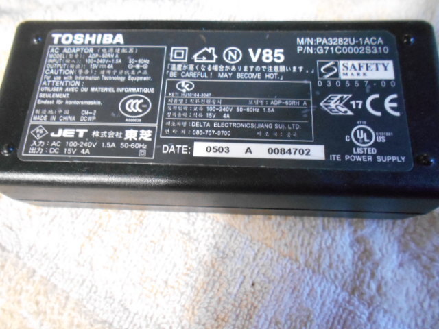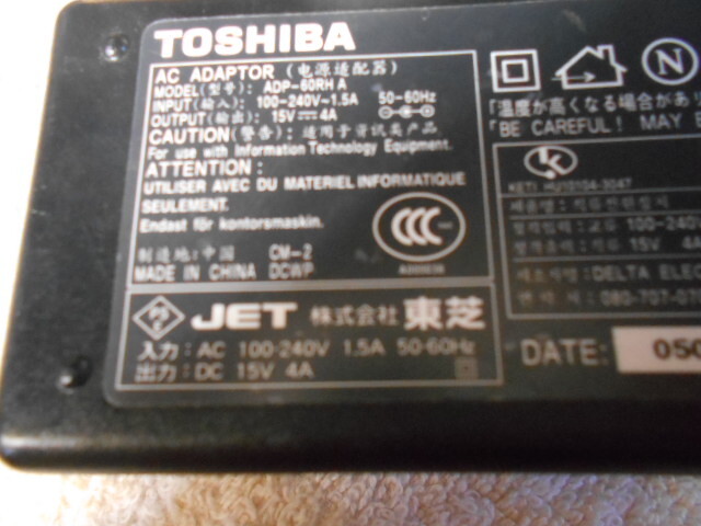★TOSHBA/東芝 ACアダプター MODEL ADP-60RHA 出力15V‐4A 通電確認 電圧確認 中古★