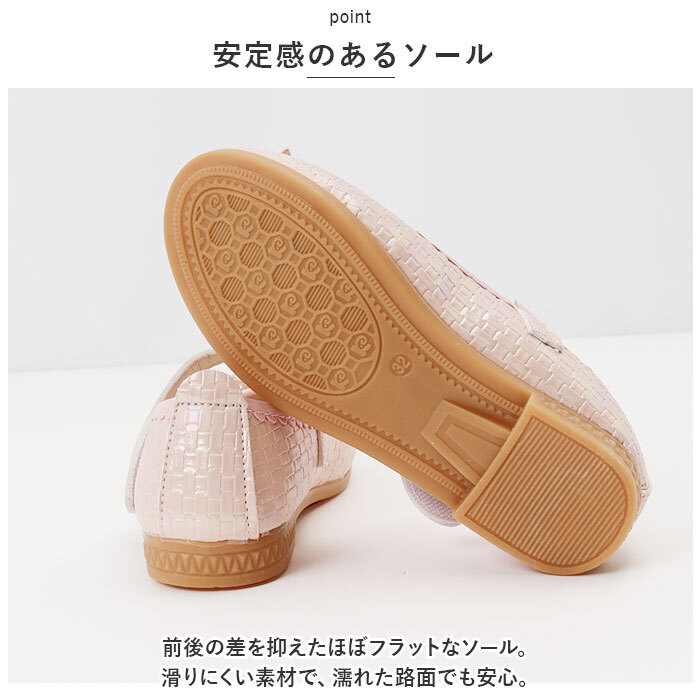 | 商品説明 | ・・足元もおしゃれに♪キュートなフォーマルシューズが登場。 ・【可愛さアップのポイント】 ・光沢のあるPU素材を使用。つま先部分に配置された、立体的なリボンが印象的♪イミテーションパールやキラッと光るストーンもプラス。 ・【面ファスナーで着脱カンタン】 ・ストラップは面ファスナー式なので、お子さま1人でも脱ぎ履きラクラク。 ・【歩きやすさが向上】 ・屈曲性があり、つま先にかけてやや上を向いた形状。つまづきにくく、蹴り上げやすい! ・【安定感のあるソール】 ・前後の差を抑えたほぼフラットなソール。滑りにくい素材で、濡れた路面でも安心。 ・【フォーマルシーンで】 ・発表会やパーティーなどのお呼ばれシーンで大活躍! |
