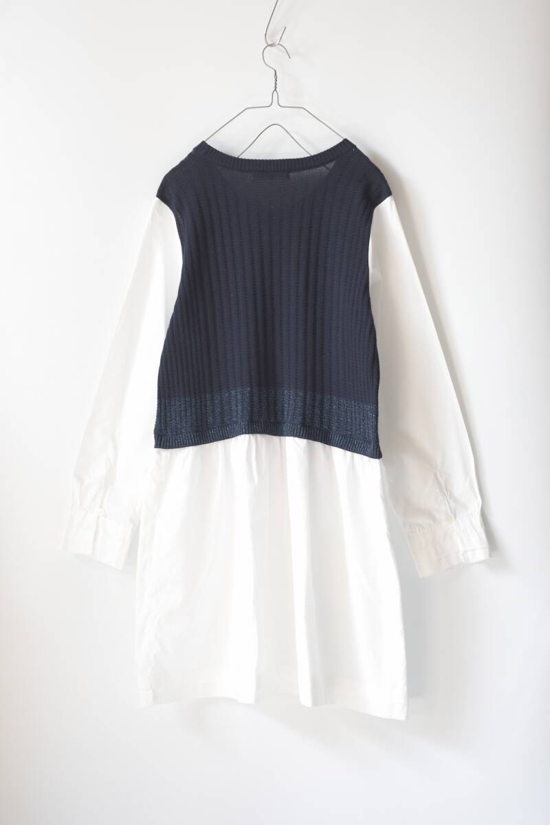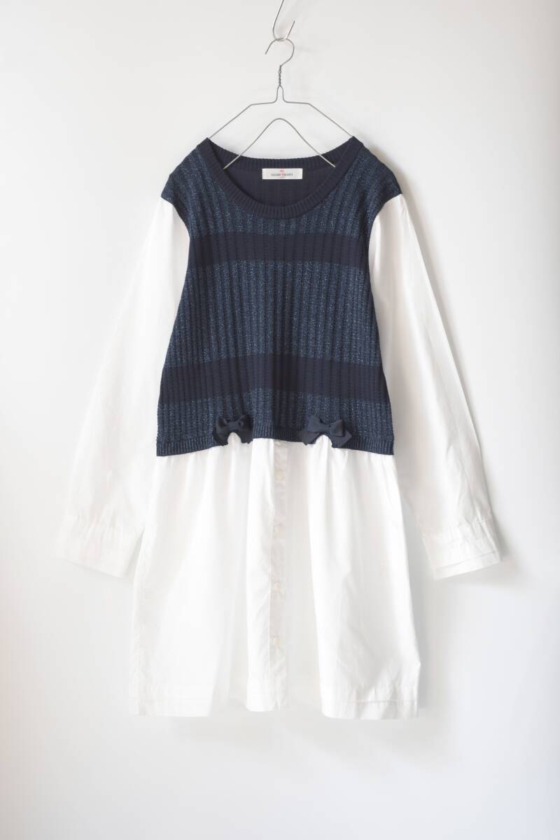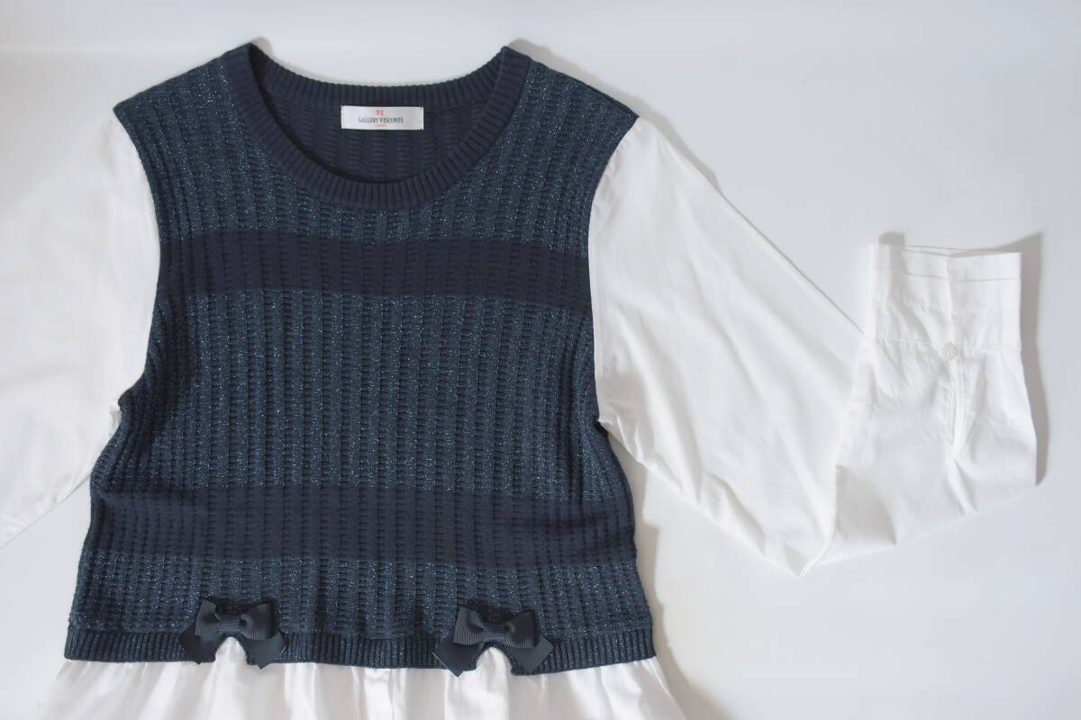編地はストライプ、模様はボーダーのラメ入りニットと、しなやかなシャツ生地を組み合わせた、品の良い可愛らしさがある一着です。