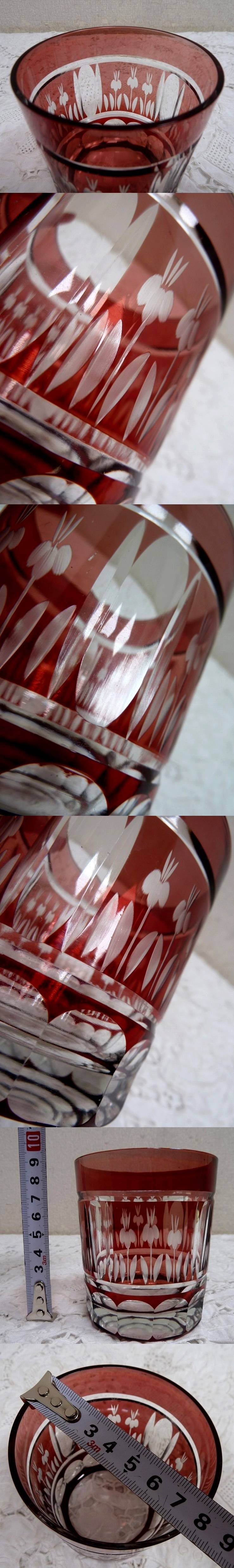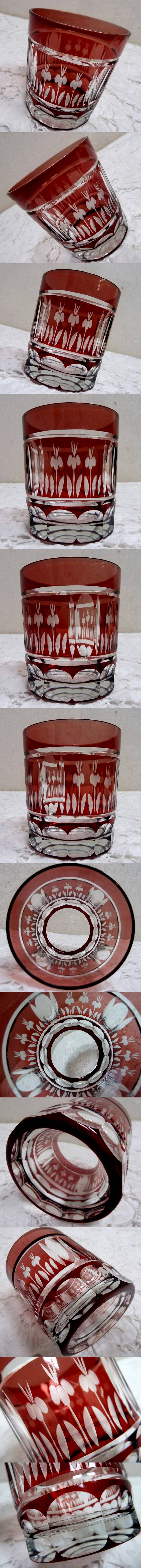 (☆BM)レッド ガラス ロックグラス(0819-③)赤 切子 カットガラス タンブラー レトロ 酒器 茶器 320ml