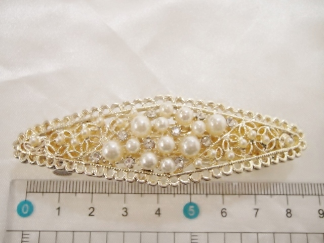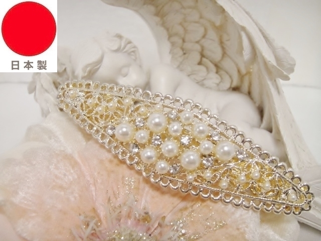 ♪ 新品 バレッタ 日本製『高品質/ロングサイズ/レクタングル/◇型/透かし模様/パール&スワロフスキー』♪