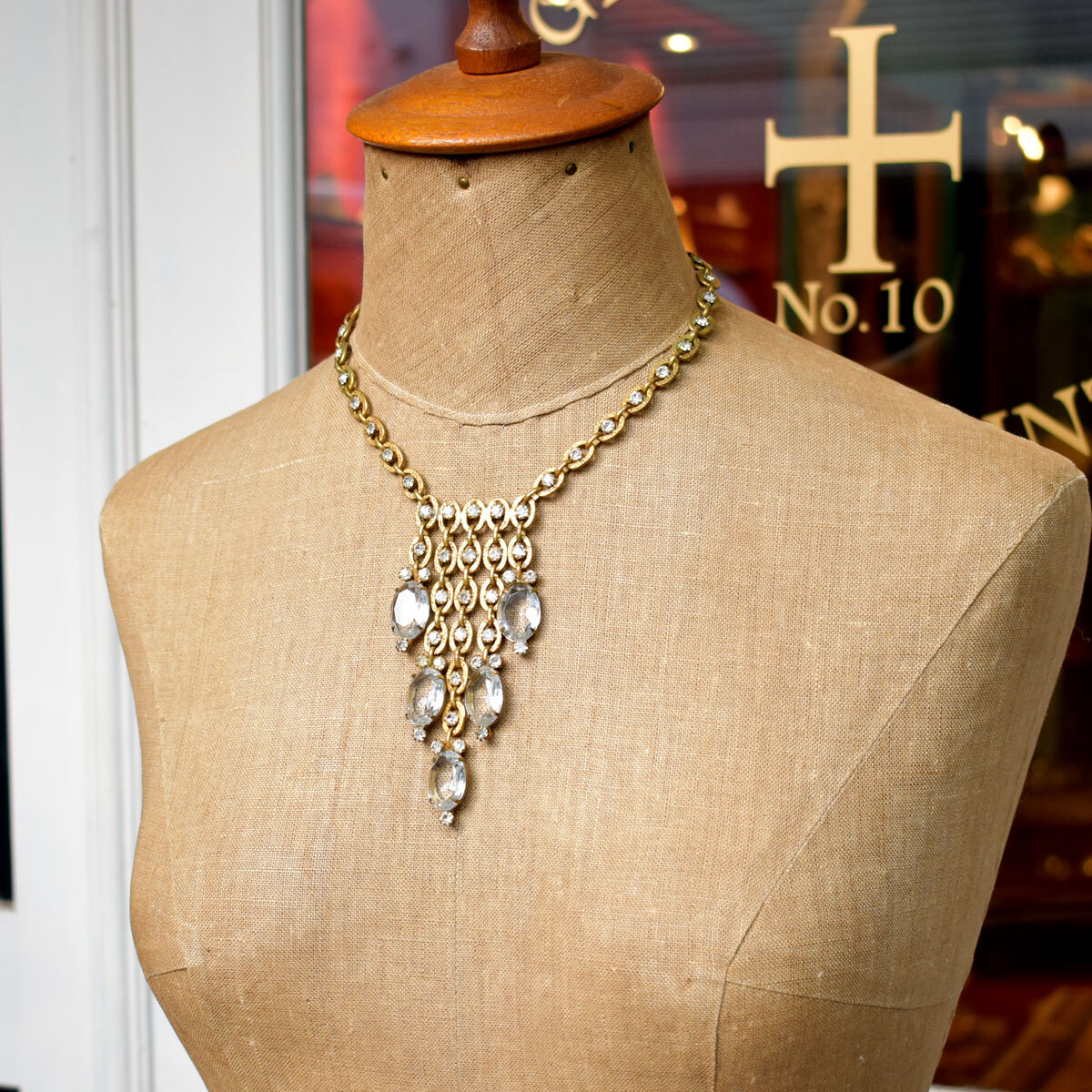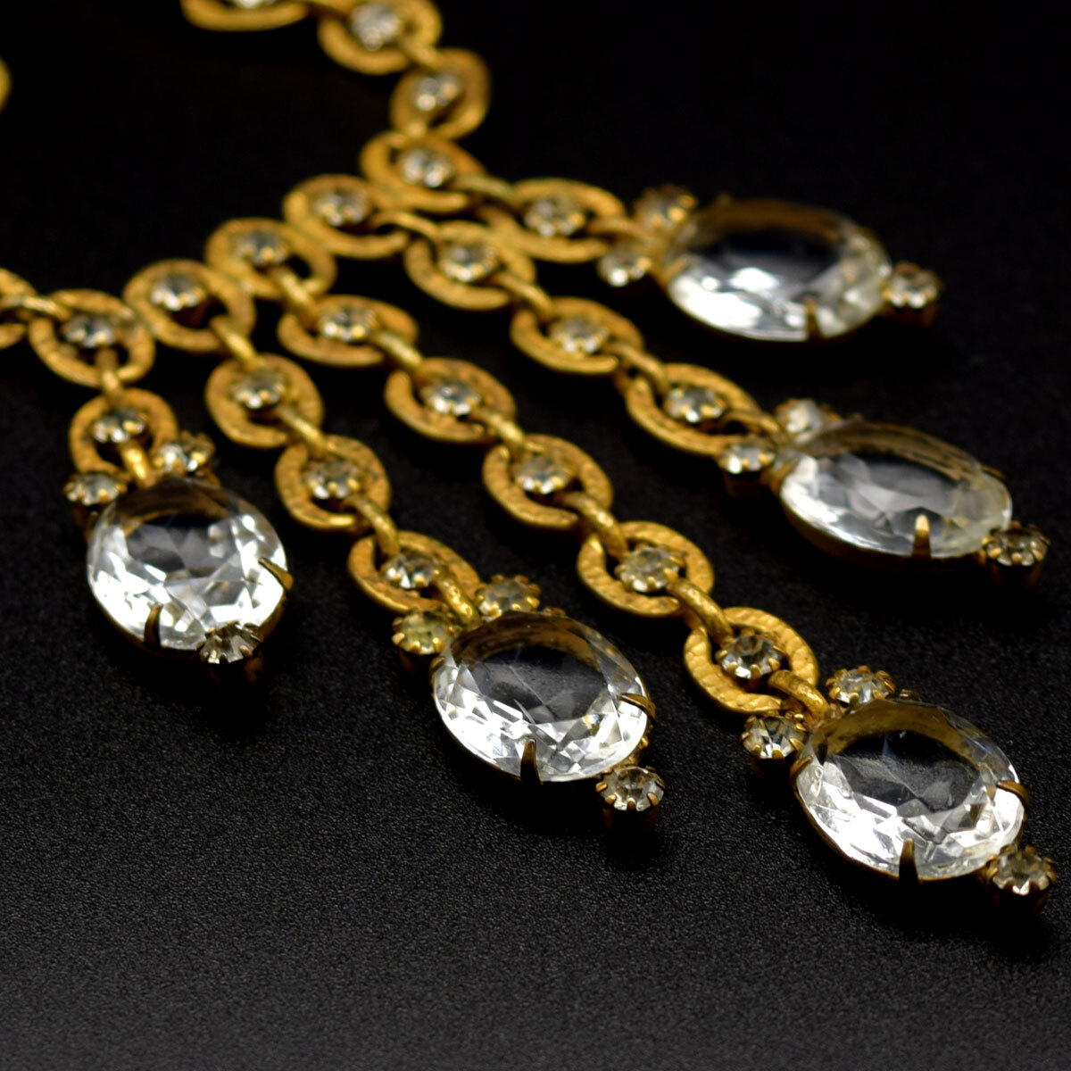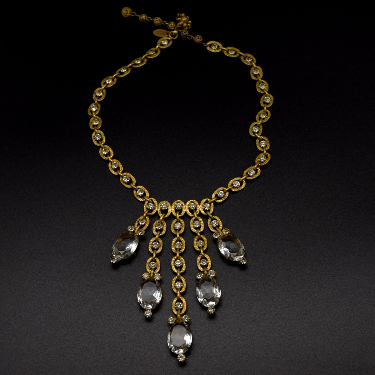 ネックレス中央から、流れるように五本のフリンジが下がる