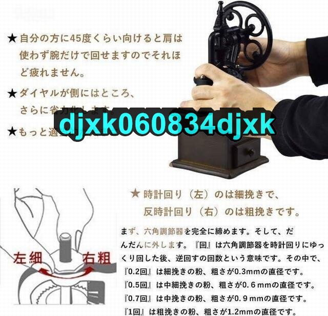 一回挽ける量は約50g 木製復古円盤式 レトロなデザインなのでおしゃれなインテリアとしても楽しめます。 セラミック刃の下の調節で簡単にお好みの挽き方ができます。 豆から手軽に挽きたて、楽しめる豊かな香りが部屋中に広がります。 美味しい珈琲を味わえます。 注意:細かい設計は予告なしで変わる可能性がございます。ご了承ください。 海外インポートなので、細かいホツレや汚れが有る場合がございます。そして,宅配便で発送しますので,箱付きの商品は角部分が凹む可能性がございます。ご理解の上ご購入ください。