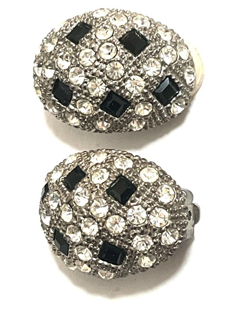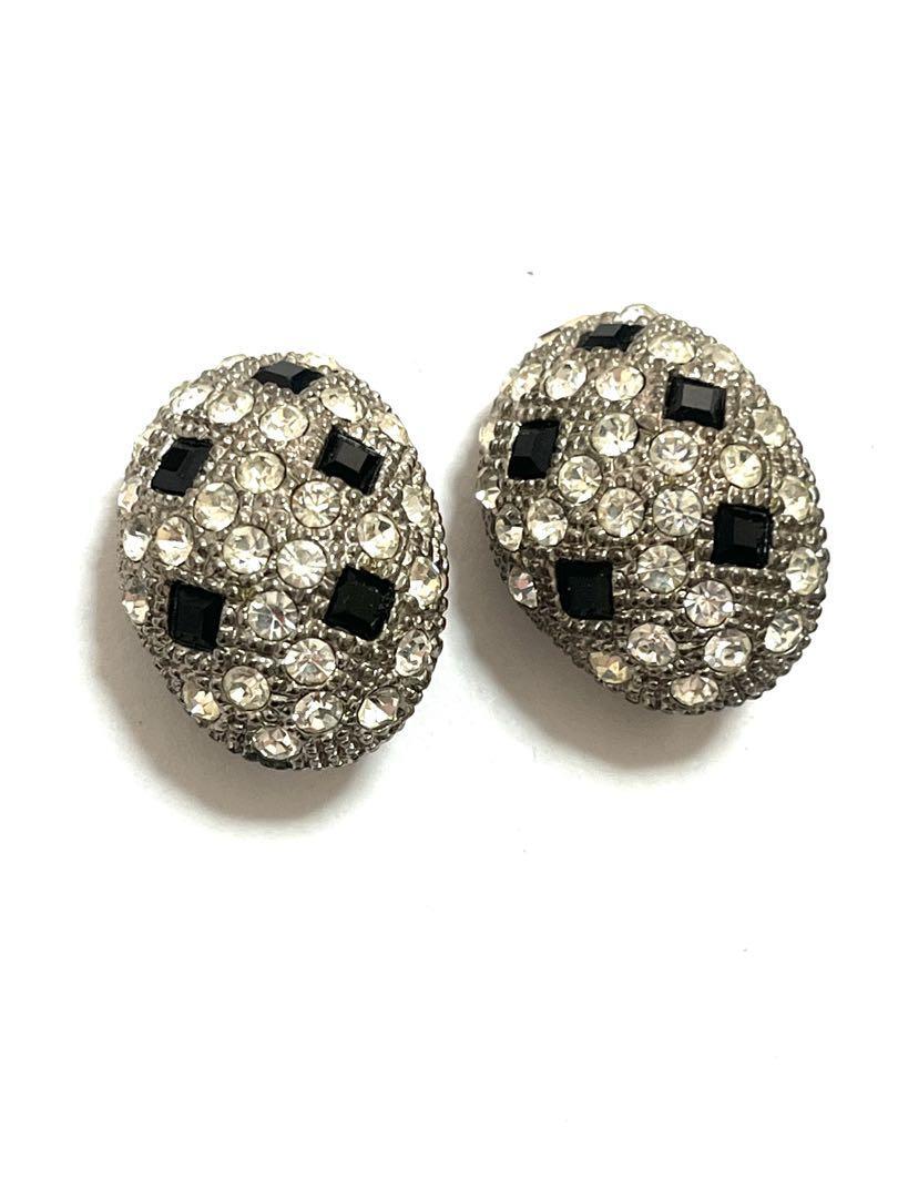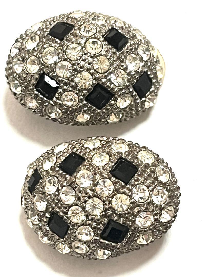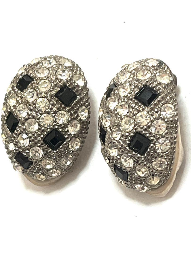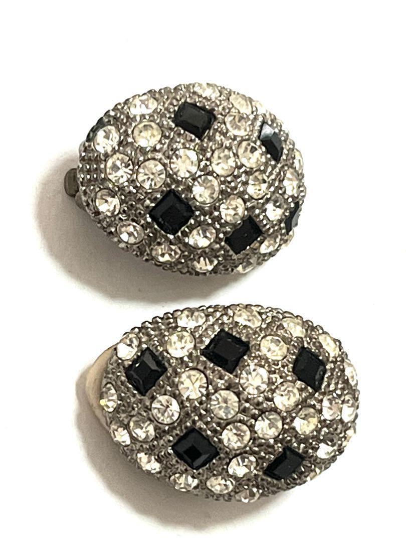 黒とクリスタルのオーバル型イヤリング、クリアクリップ式バック付き。ヴィンテージ 1980年代 アールデコ風