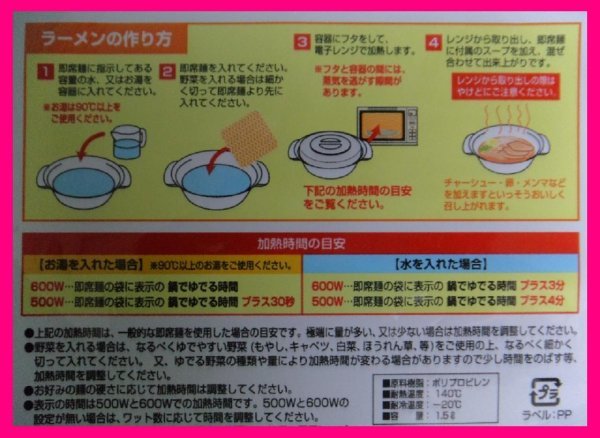 ★ガス代が浮くので節約&経済的:鍋やお皿を用意しなくてもよいため、洗いものも減る。 ・レンジで簡単にラーメンが出きるお手軽調理器 :もやしやキャベツなどの野菜を入れ更においしく!!! ・鍋いらず、丼いらず、手間いらず:即席ラーメンがレンジで簡単!!! (鍋でゆでるよりも少量の水でお手軽調理) ★お湯入れてチン!!! ワンボウルラーメン!簡単。洗い物少ない!美味しい! ・1人前用、 大きさ:約20cm ・耐熱温度 140℃、耐冷温度 ー20℃ ・未使用/新品 ★★★ お得情報 ★★★ ・複数などのいろいろなセットも準備可能です。 (入札前に、ナビにてご質問頂ければと思います) ・気になるところがありましたらご質問してください。 (デザインが多少異なることが御座います) (色はお任せになることが御座います) ・他にも出品中ですのでご覧下さい (^-^)。 まとめていかがでしょうか。 ・それではよろしくおねがいします。 | |||