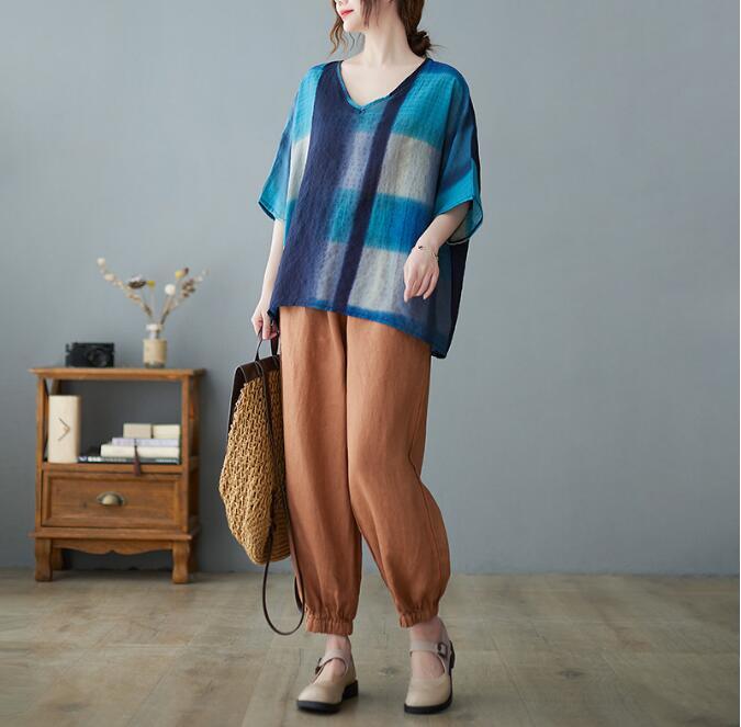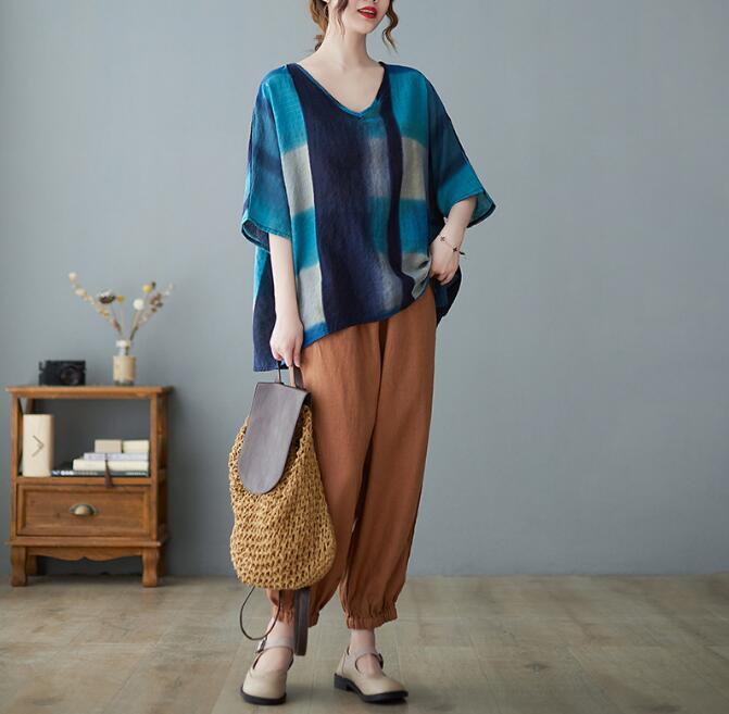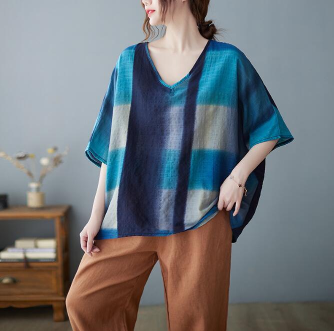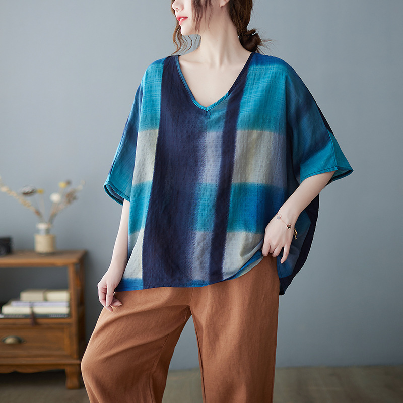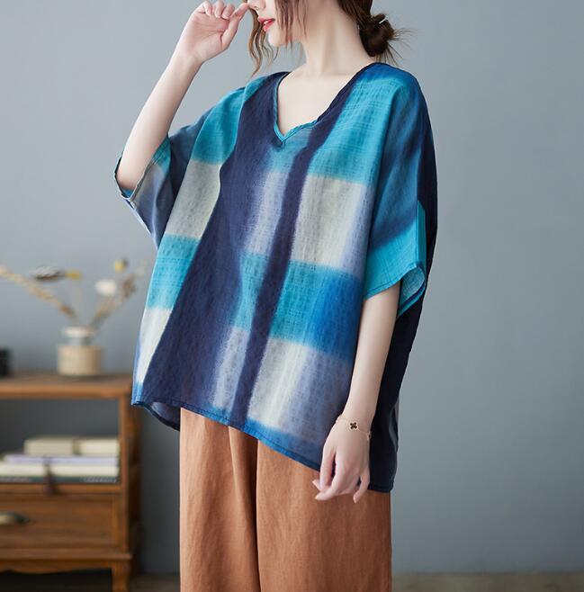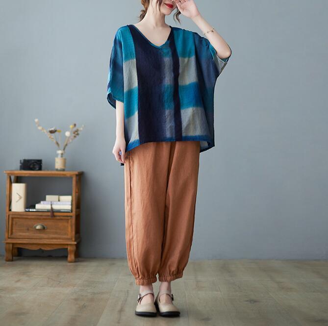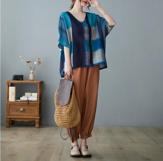 新入荷新品春夏レディースカジュアルプリント柄体型カバーゆったり大きいサイズシャツブラウスブルー
