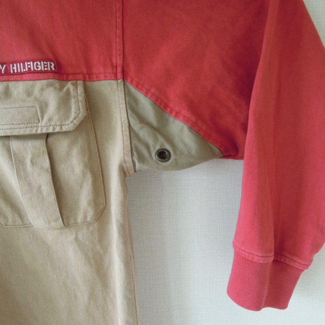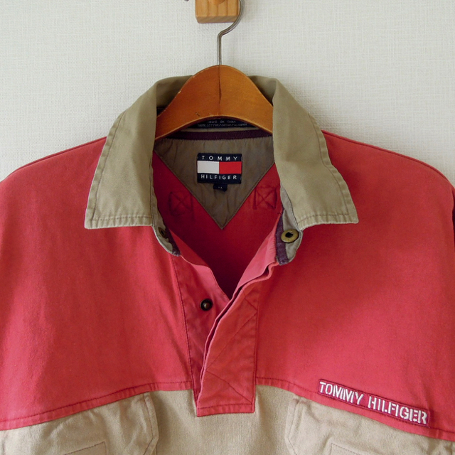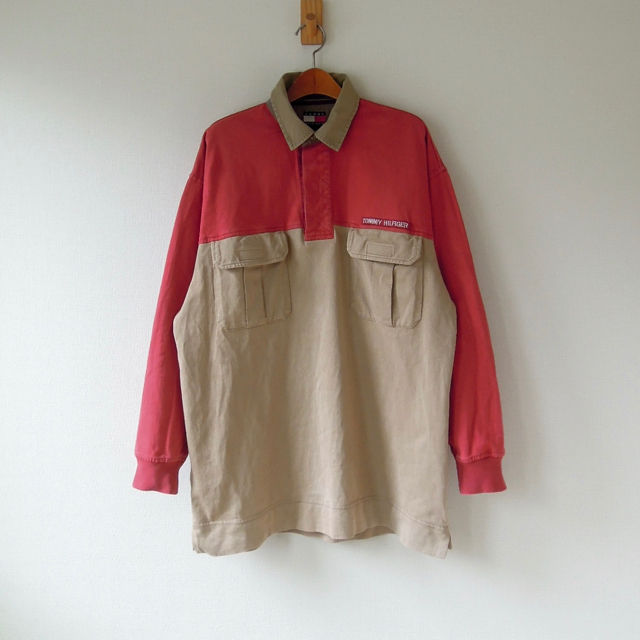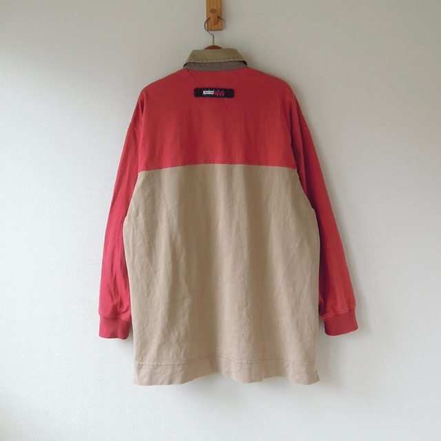 ”OUTDOOR”ラインのモデルで、身頃はカットソー生地、襟、脇のガゼット部分はシャツ生地の切り替えになったラガーシャツライクなデザインです。