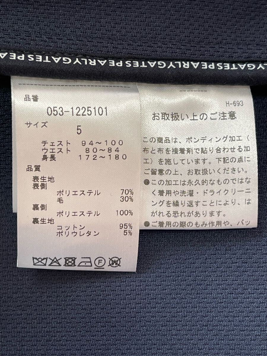 サイズ(5)身長172-180cm/チェスト94-100cm(メーカー参照)平置き採寸:肩幅47cm/身幅59cm/着丈76cm(やや大きめ通常サイズ(6)の方可能)素材:表地ウール毛混.ポリエステル(裏地)ポリエステル.コットン.ポリウレタン製/表地起毛防寒保温性/裏地独自ダンボールメッシュ構造により蒸れずに通気性加工/内側PEARLY GATES連ロゴテープロゴ縫製/厚手ピーコートデザイン/カラーダークネイビー(黒色系)背面BIG PEARLY GATES×PGストーリーロゴ+PGワンポイントロゴ刺繍加工/開閉部PGロゴボタン/PGロゴボタンポケット×2/直営店希少完売大特価商品(定価85,800円税込:見本値札サイズ(4)共有)2時間位着用。素材上毛羽立ち等有り。その他機能障害無し。ご理解頂けた方限定でお願い致します。写真撮影での色合いが遮光率により実際の色と異なる場合が有ります。予めご了承願います(((価値観の相違など回避の為パーリーゲイツ商品をご存知の方でお願い致します。色合いが特に気になる方はご遠慮下さい)))最終お取引受取連絡完了可能な方でのご落札をお願い致します。
