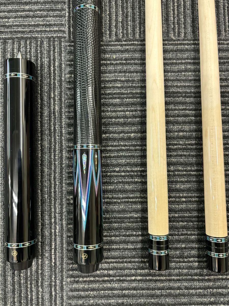 角芯の2重コア入り(カーボン内蔵)グリップ部分は4分割ハイブリッド(自然乾燥特硬メープル)半真空、お尻穴(撞き音が高くなる)