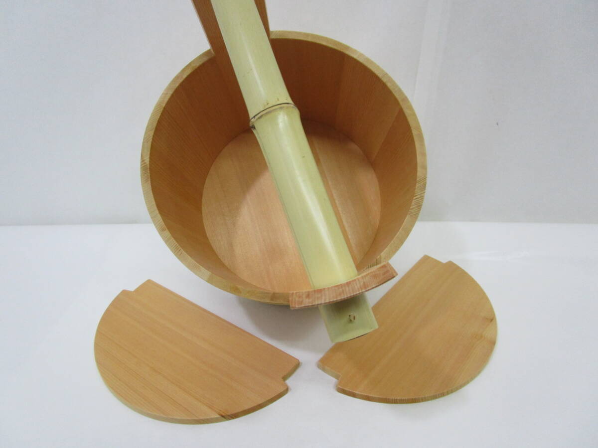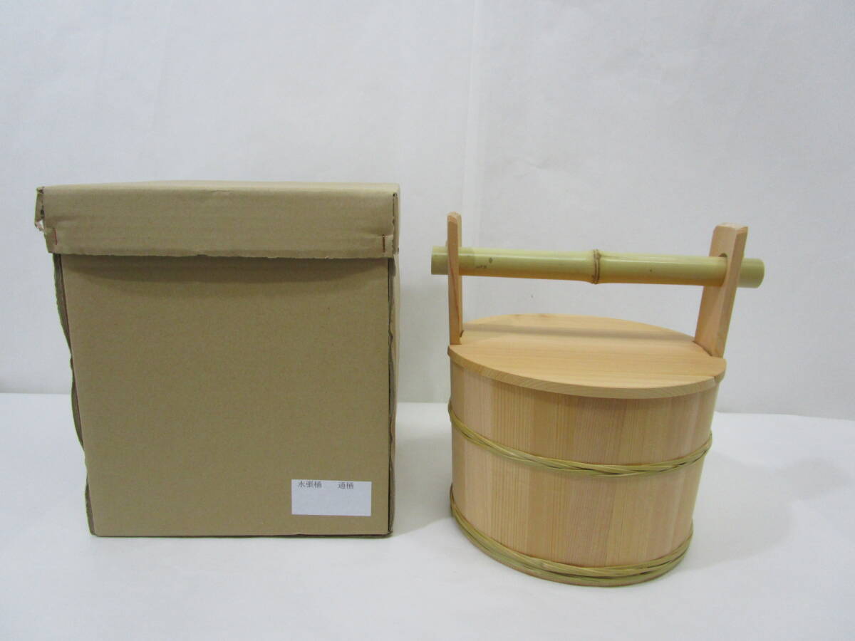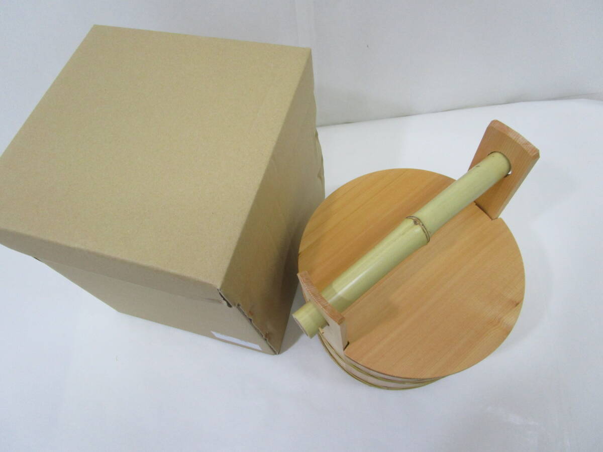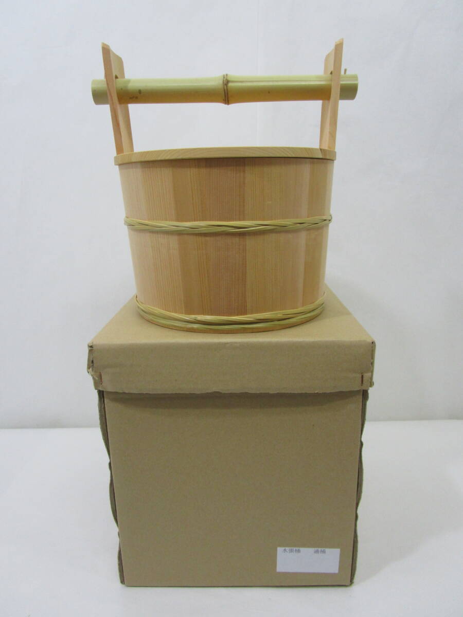 「未使用・露地道具」木曽の椹(さわら)材の水張桶です。サイズ:直径24cm (蓋25cm) 高さ18cm (把手最上部巾25.5cm 高さ29cm) 持手部の竹は固定して有りませんので回転します。 在庫未使用品。紙箱。 どうぞ宜しく。『天然の椹材ですので日の経過により椹ヤニが出て来る場合が有ります。御了承置き下さいませ』