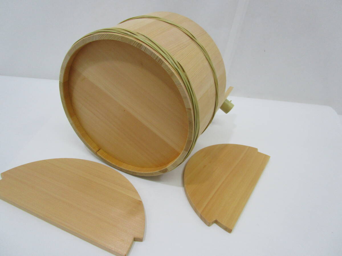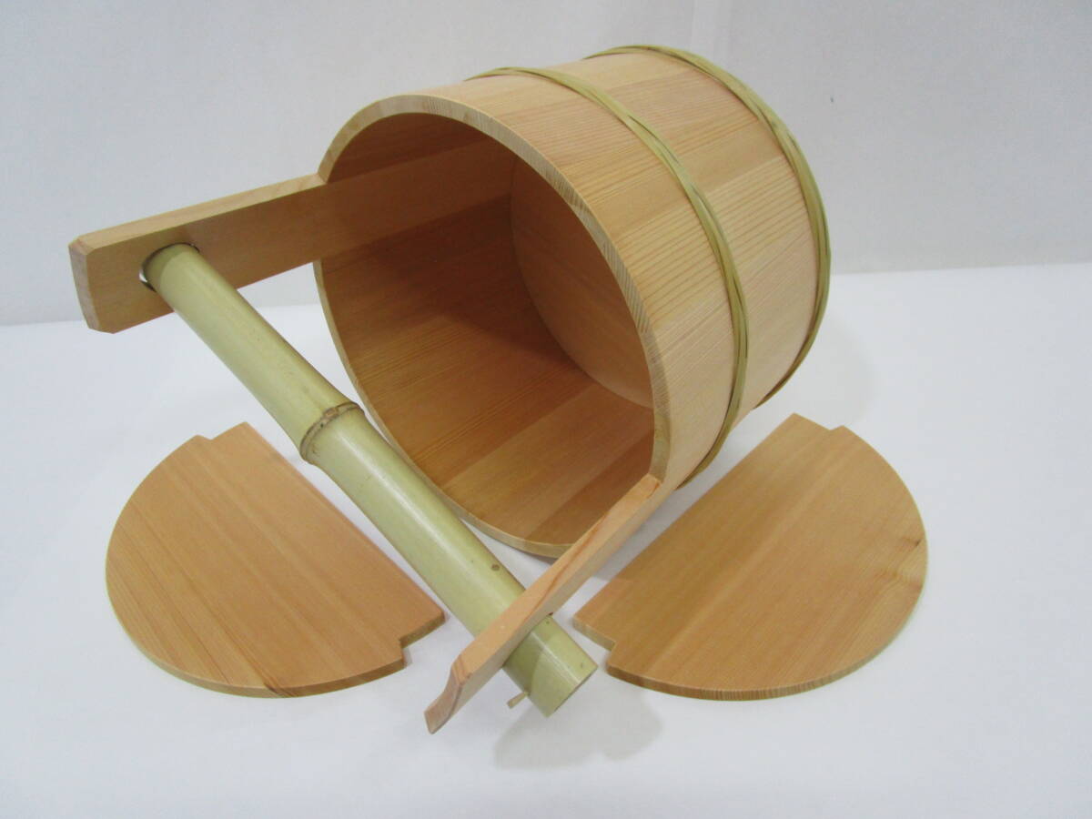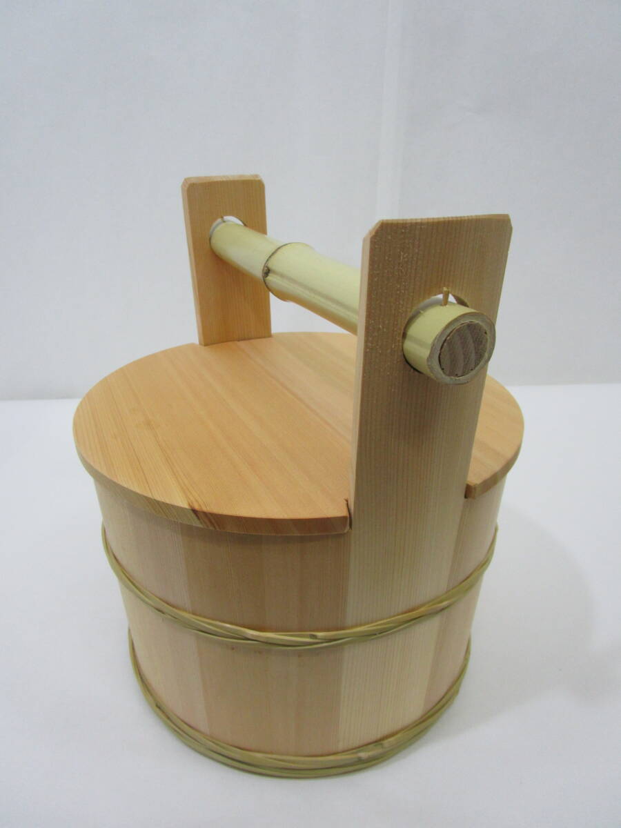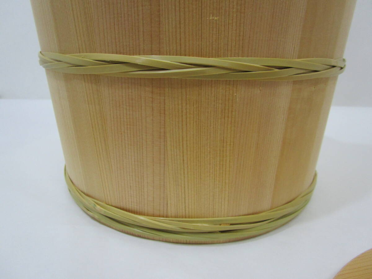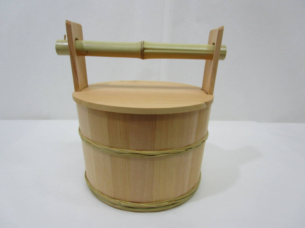 「未使用・露地道具」木曽の椹(さわら)材の水張桶です。サイズ:直径24cm (蓋25cm) 高さ18cm (把手最上部巾25.5cm 高さ29cm) 持手部の竹は固定して有りませんので回転します。 在庫未使用品。紙箱。 どうぞ宜しく。『天然の椹材ですので日の経過により椹ヤニが出て来る場合が有ります。御了承置き下さいませ』