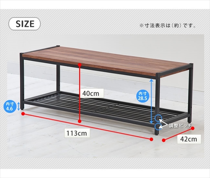 | 本体:幅 約1130×奥行 約420×高さ 約400mm 天板厚:約20mm 調整ピッチ1ヶ所:約50mm間隔 |