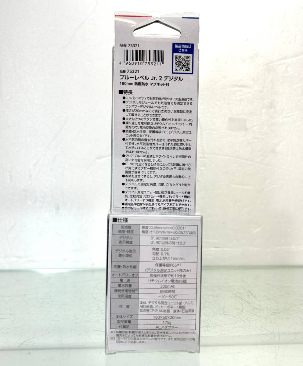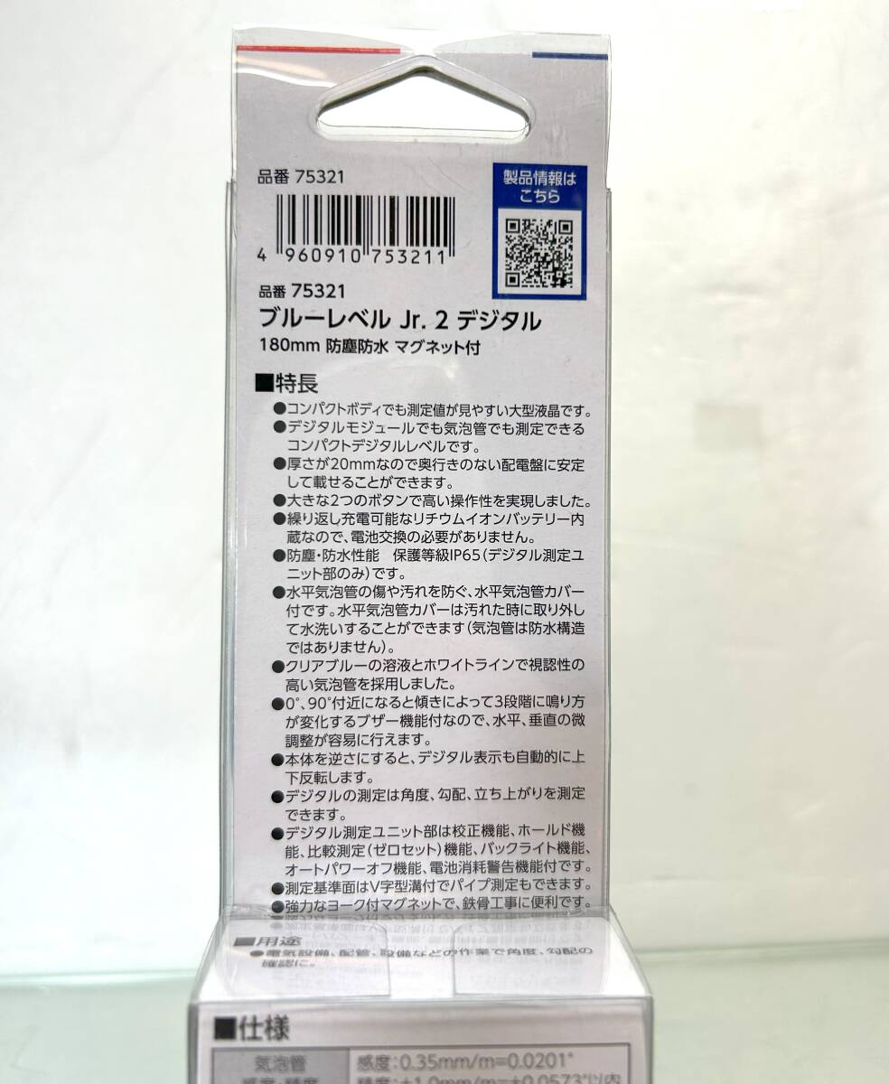 シンワ測定 ブルーレベル JR2 デジタル 型番:75321 デジタル180mm 防塵防水 マグネット付