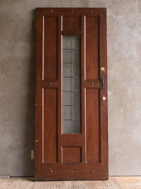 イギリスの蚤の市で見つけてきた古い、木製ドアです。鉄製スタッズ、取手が付いています。使い込まれた風合いがとても素敵です。立てかけてお部屋のインテリアにしたり お花屋さんや雑貨屋さん等 ショップディスプレイの アクセントにもオススメです。 桟、カマチが長年の使用により磨耗があります。取り付けてご使用の場合加工、調整が必要です。ガラス部、傷(画像参照)がありますが、 ヒビ、チップはありませんペイントの劣化は少しづつ進行します。 ご注文時期により現状とは多少状態が違っている場合もございますので、ご購入前にお問い合わせください 。 古いものとご理解ください。 古いものとご理解ください。 ひねりが有ります。