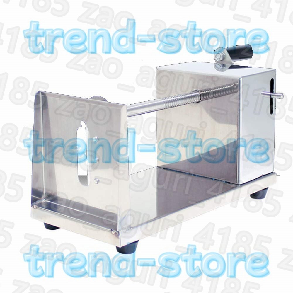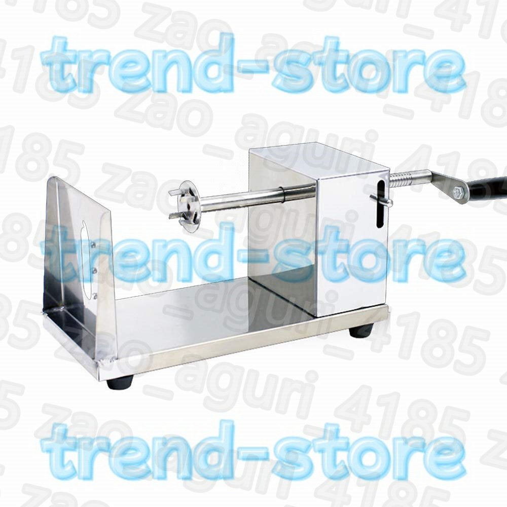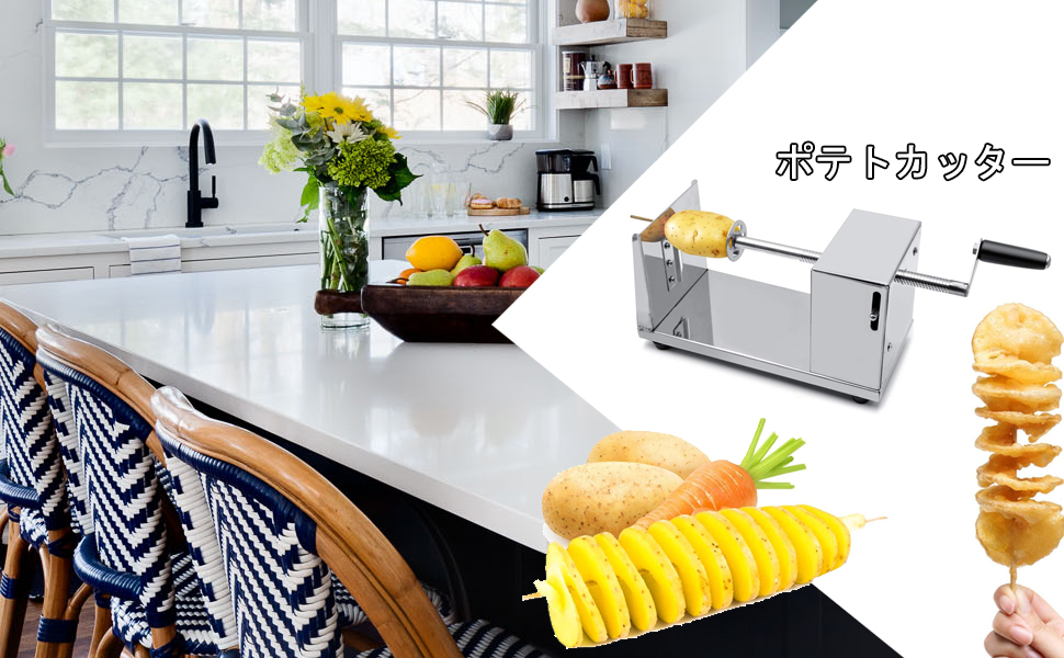 | 三角差し棒:ハンドルを回してじゃがいもを回転する時、じゃがいもが逃げにくい。 | 使用方法:じゃがいもを串に刺してから機体に固定しハンドルを回すことで切れ込みを入れます。 | ハンドル式ポテトカット:力のないお子さんや女性でも扱いやすいので、ホームパーティーにあれば盛り上がるアイテムです。 |