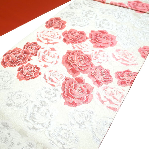 袋帯 京都 西陣 訪問着や振袖に 銀糸 銀 シルバー 白ベージュ 薔薇 バラ ばら 花 お花 フォーマル 成人式 成人 振袖 訪問着 着物 結婚式 七五三 入卒式 などに 春 秋 冬 お洒落 おしゃれ オシャレ 上質 上品 正絹 絹 豪華 華やか 六通 六通柄 リサイクル リユース なごみ 中古 仕立て上がり品 kp1466