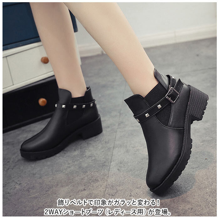 商品説明 | ・・飾りベルトで印象がガラッと変わる!2WAYショートブーツ(レディース用)が登場。 ・【パンクロック風の飾りベルト】 ・パンクロック風のメタルスタッズがあしらわれたベルトは取り外しOK! ・スタイルやシーンに合わせて2通りのコーデが楽しめる♪ ・【サイドゴアブーツ】 ・履き口にゴム布が縫い込まれたサイドゴアブーツだから、脱ぎ履きしやすい! ・【高めのヒールでスタイルアップ】 ・歩きやすさと見た目のバランスを考えたヒール高約4cm。足長効果でスタイルアップ♪ ・【軽量】 ・ハードな見た目と違い、軽量で長時間履いても疲れにくい! |