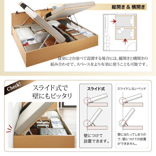 お客様組立 国産跳ね上げ収納ベッド ナチュラル 薄型プレミアムポケットコイルマットレス付き 横開き セミダブル 深さレギュラー