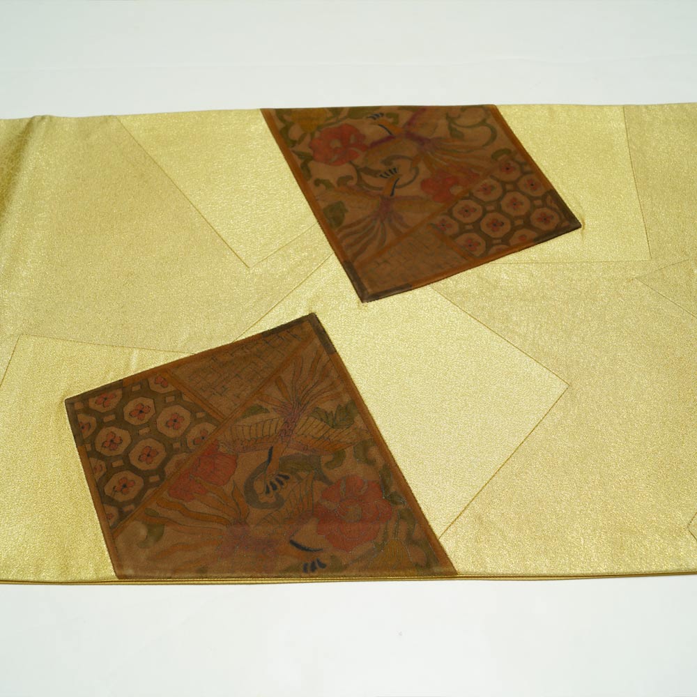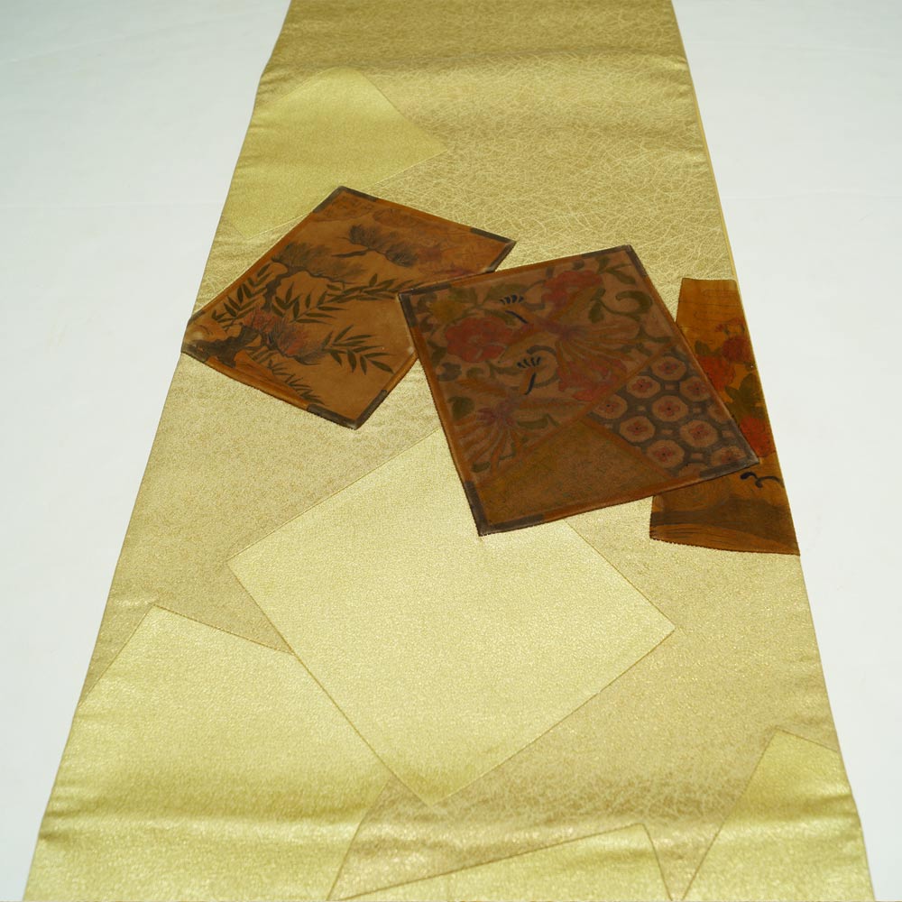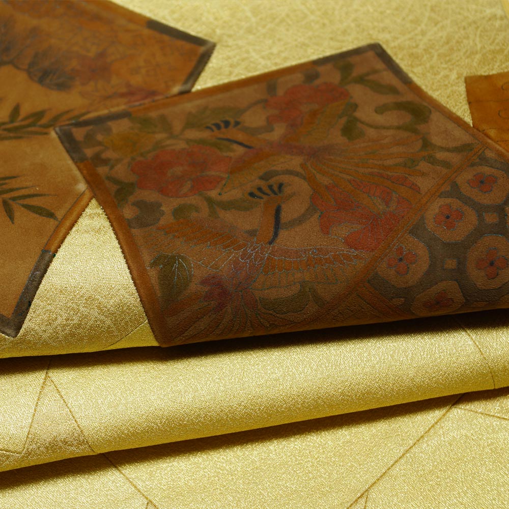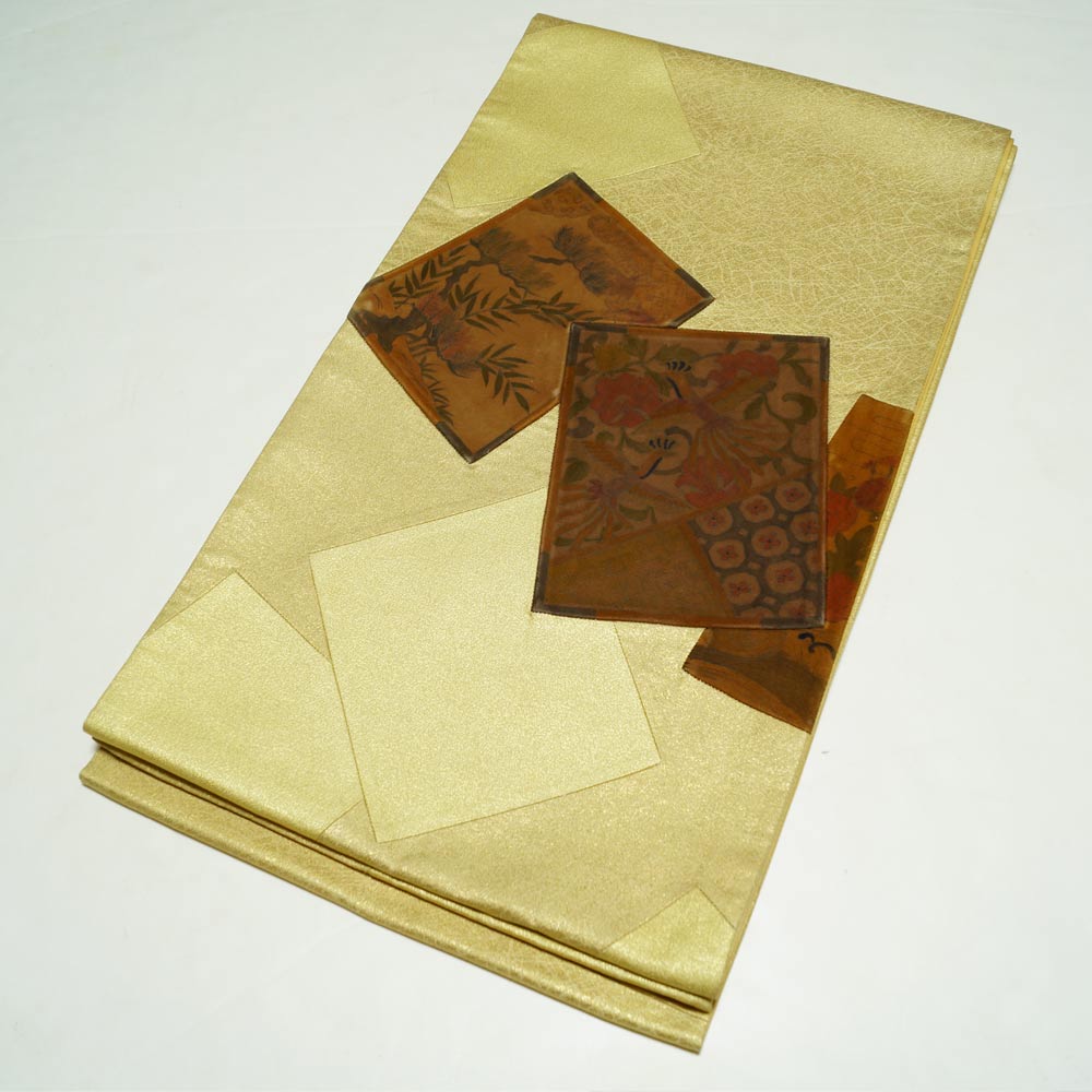 | 品 名 | 袋帯 切りばめ 革 色紙に鳳凰、春秋模様 金色系 お太鼓柄 【袋帯 中古 袋帯 リサイクル 袋帯 フォーマル 袋帯 リサイクル着物 帯 正絹 袋帯 モダン 着物 袋帯 中古 】 | ||