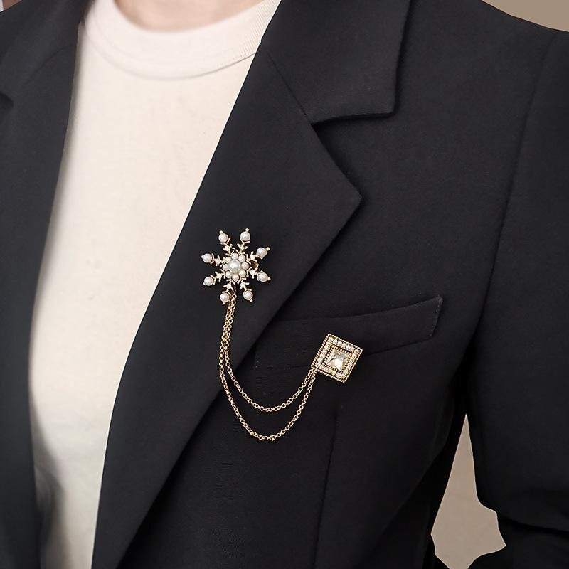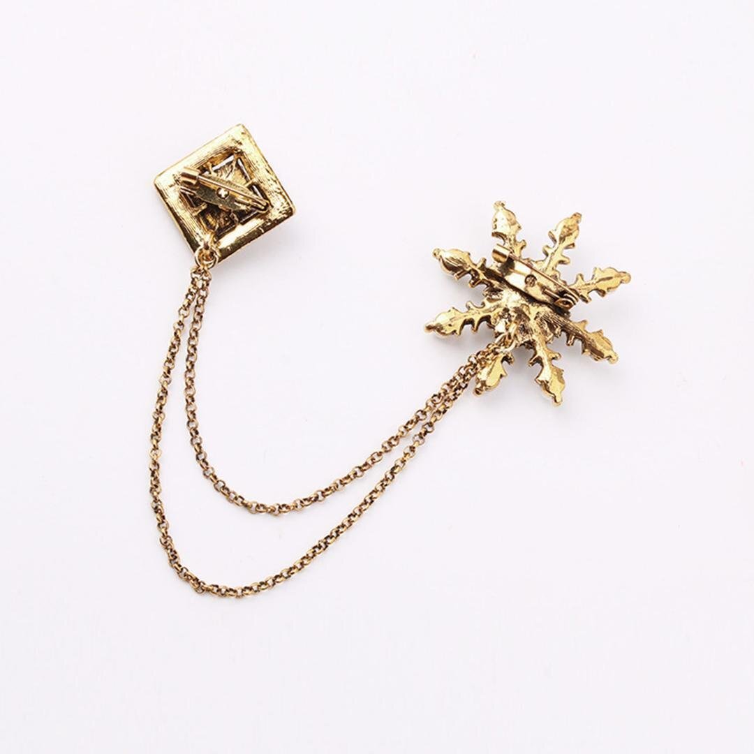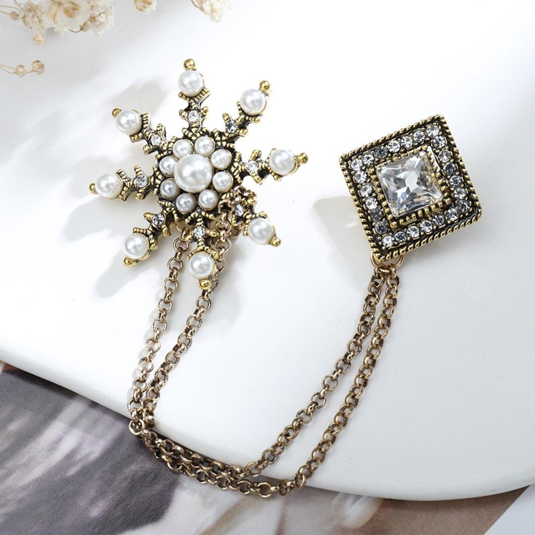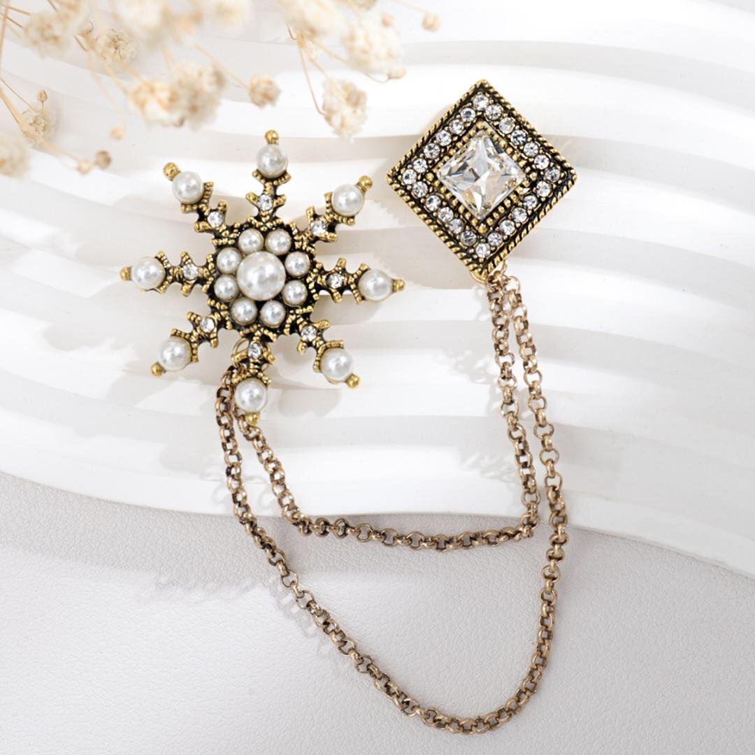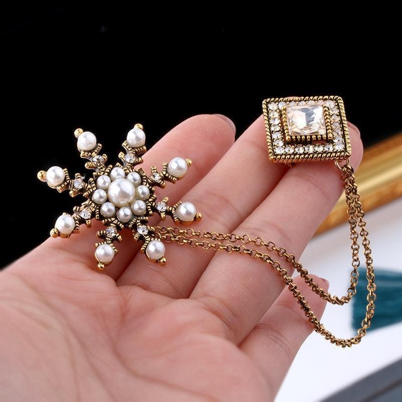 高級 レトロ パール 雪の結晶 菱形 チェーン ブローチ/ゴールド