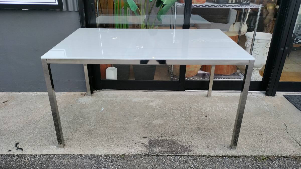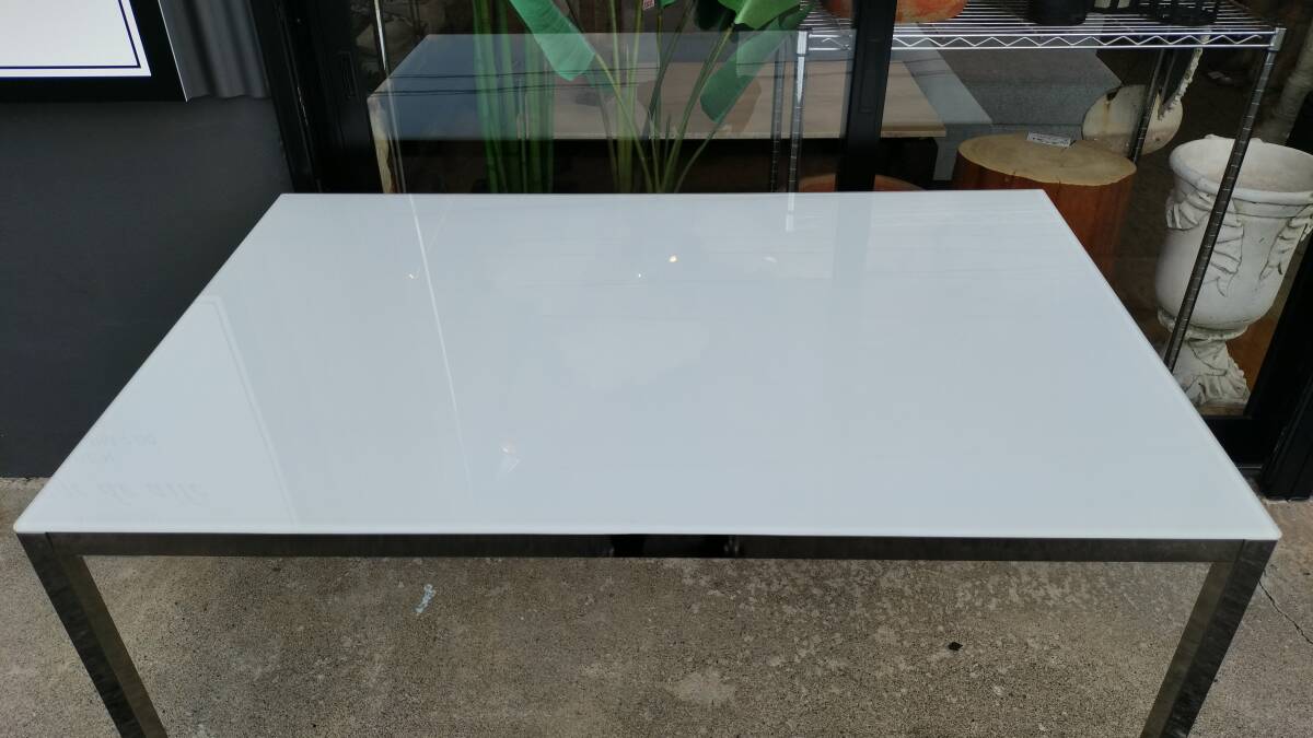 シルバーのクロムメッキのフレームに白いガラス天板が乗せてある状態です。