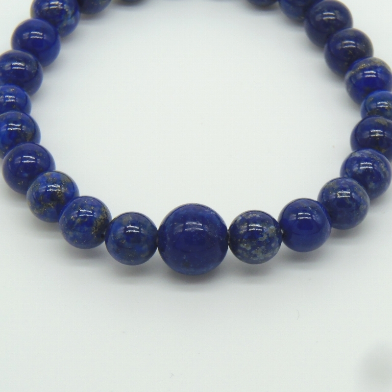 | ラピスラズリの丸玉を使用しております 玉のサイズ 親玉:約10mm 主玉:約8mm 内寸法 約17cm程度 ※玉を繋いでいるのはゴムですので多少伸びます 桐箱付属 |