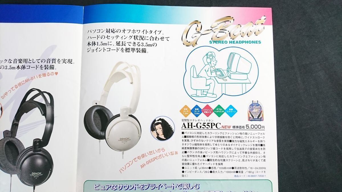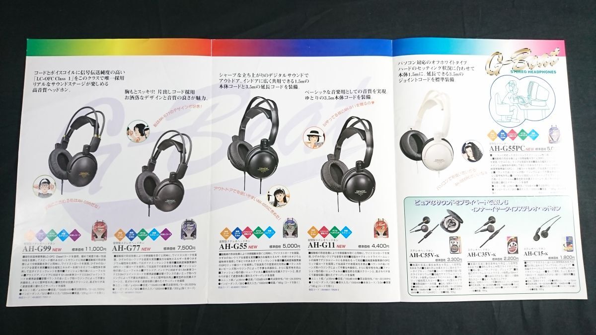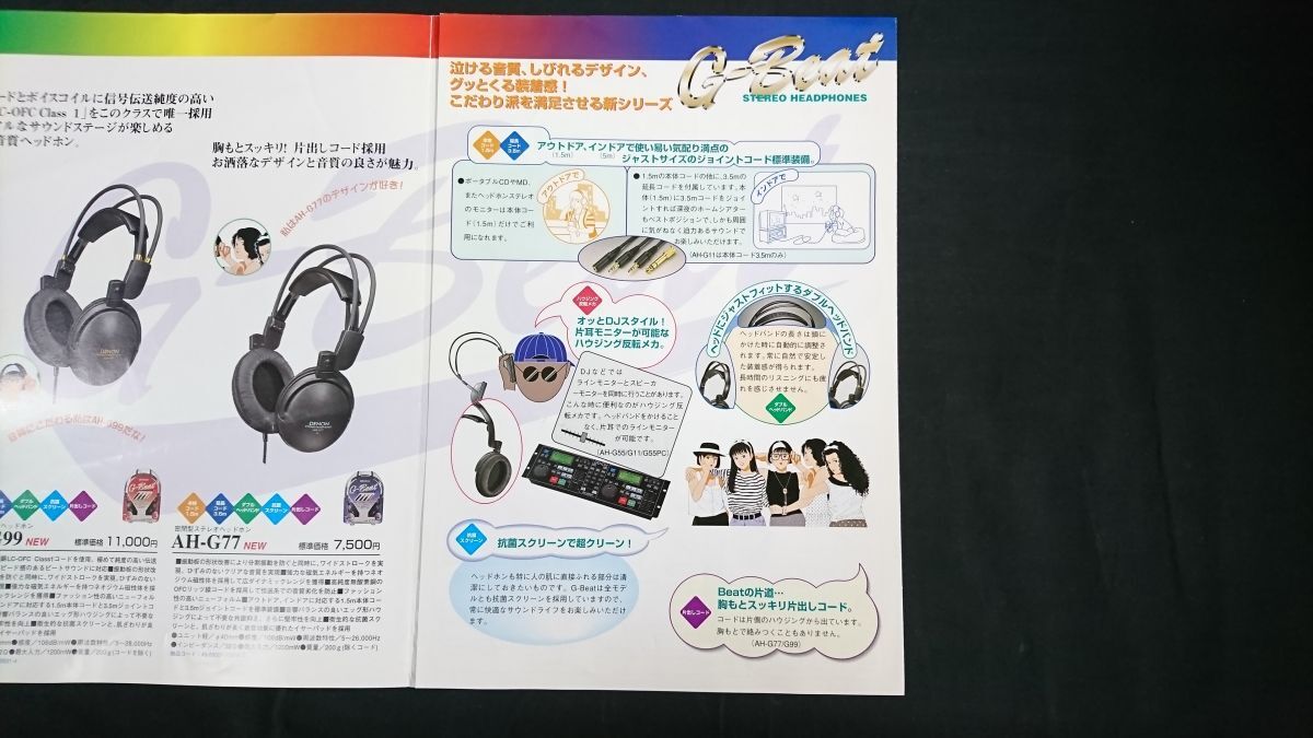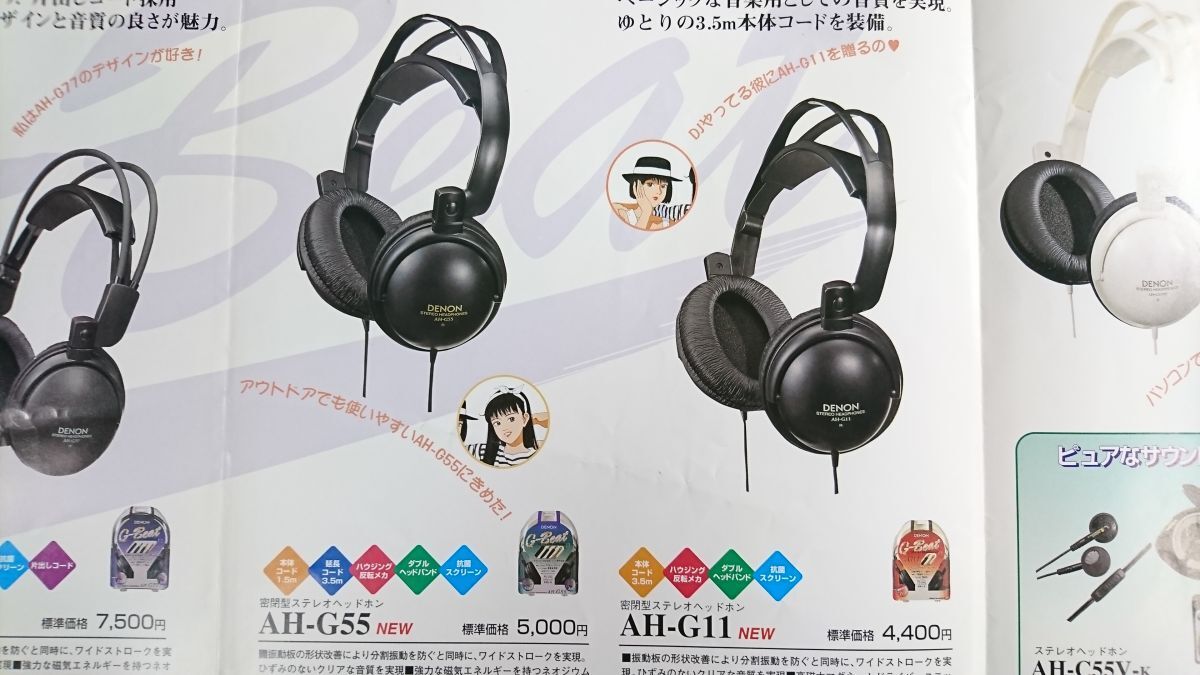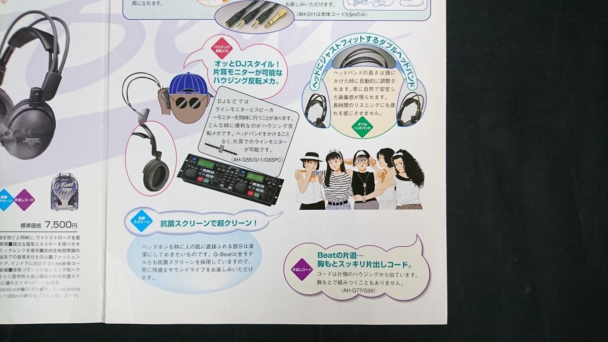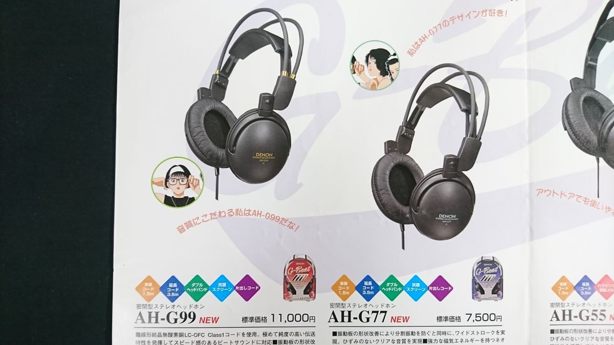 | 『DENON(デノン) G-Beat STERO HEADPHONES(ヘッドホン) 総合カタログ 1997年5月』絵:江口寿史 日本コロムビア株式会社/AH-G99/AH-G77/AH-G55/AH-G11/AH-G55PC/AH-C55V-K/AH-C35V-K/AH-C15-K | |