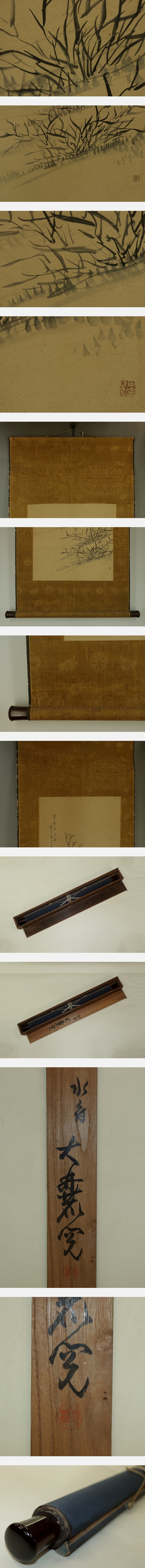 田能村竹田 たのむら-ちくでん(1777-1835) 江戸時代後期の画家。 安永6年6月10日生まれ。豊後(大分県)岡藩医の次男。藩校由学館の頭取となる。 藩内の農民一揆の際,藩政改革の建言がいれられず隠退。 絵を谷文晁らに学び,繊細な筆致の独自の画風を確立。幕末文人画壇の代表的な作家。 頼山陽らと親交を持ち,詩や書にも優れた。天保6年8月29日死去。59歳。 名は孝憲。字は君彝。通称は行蔵。 本紙は、染み、汚れ、折れ、皺、ヤケがあります。 表装は、染み、汚れ、軽い折れ、軽い皺、擦れ、ほつれ、生地剥れ、くすみ、箱に傷みがあります。 【サイズ】 作品 横約46cm×縦約135cm 表装 横約65.5cm×縦約190cm |